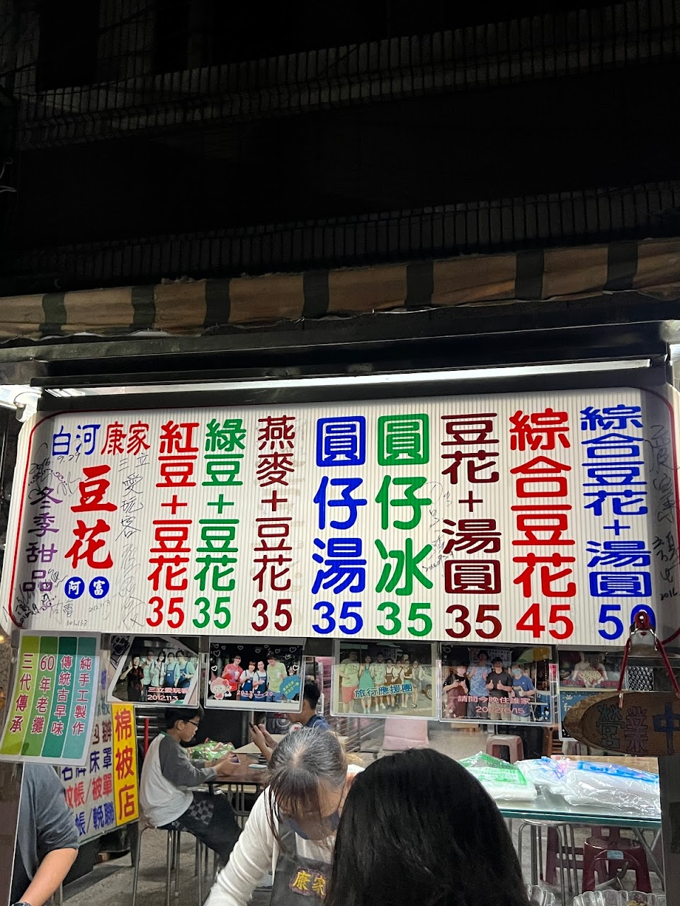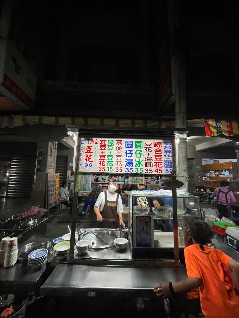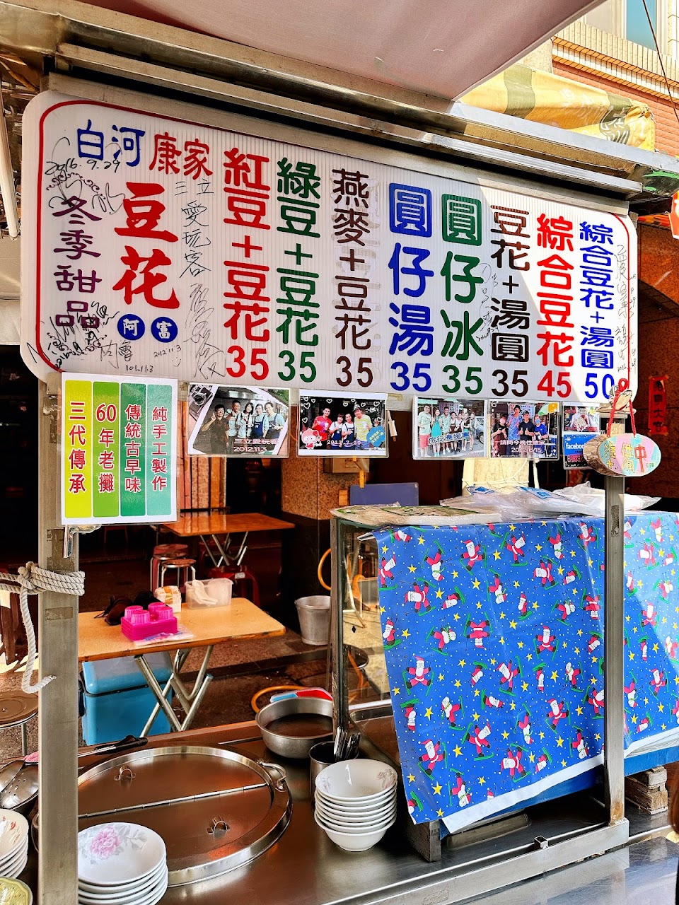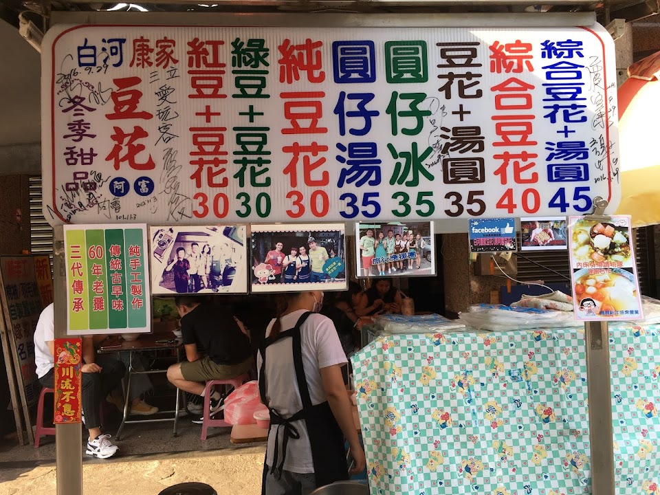 白河傳統市場附近從早到晚,分佈了許多具歷史意義又古早味十足的小吃,從煎包、春捲、豆菜麵、鴨肉麵、陽春麵到下午的鴨頭、肉圓、豆花等,而這攤看起來很一般的豆花,就是營業超過50年,祖傳三代的手工豆花。