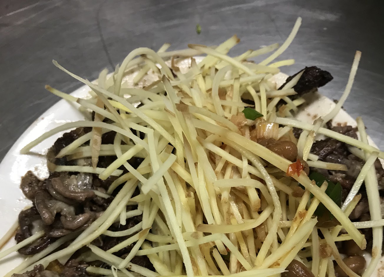 過去一向聽到虱目魚產品就想起內臟、肉皮的味道而害怕不已,更不用說虱目魚腸了。某一次在此市場內吃魯麵,家人被煎魚腸的香氣吸引,所以點了一份,我也趁機嘗試人生第一口虱目魚腸,沒想到一吃驚為天人! 毫無魚腥味,而是類似雞肝充滿動物脂肪的香氣宇口感,外皮微微金黃焦酥,內部則是滑膩柔軟,配上薑絲創造衝突的口感與氣味,即使對於熱愛嘗試各種美食的我依然驚艷而衝擊。