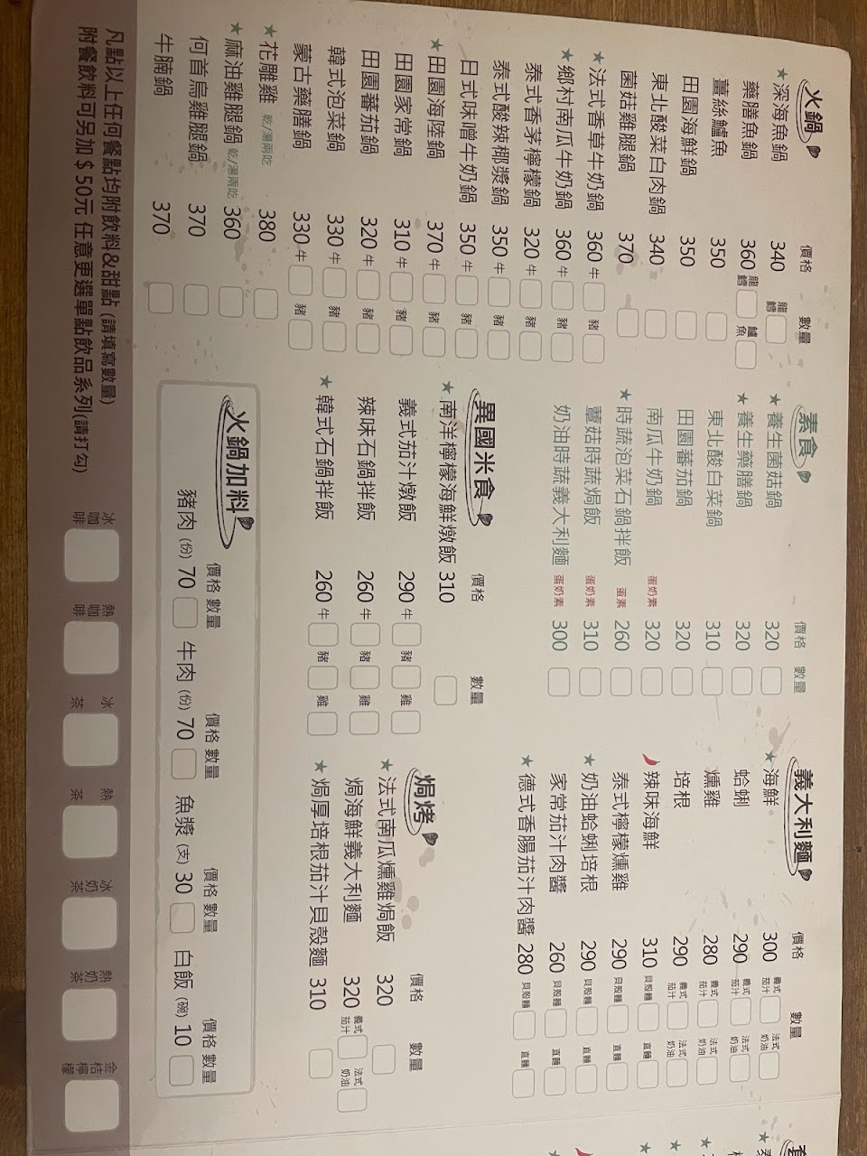 店內裝潢是溫馨的鄉村風,座位數量蠻多的,佈置用心,用餐環境很舒適,餐點選擇有鍋類、套餐、義大利麵、焗烤、燉飯、韓式泡菜石鍋…份量蠻多的,價位在2、3百,送飲品和飲料,是三五好友聚餐的好地方。