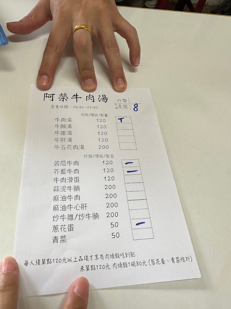 到附近辦事,看評價查到這間,來吃吃看。平日中午生意很好,一入店走來走去完全沒人招呼,我們有些不知所措,直到主動詢問才得知點餐方式,想必店裡多數是當地熟客。第一次見到牛肉湯店的肉燥飯採自取模式,旁邊標示每人低消120$才可免費使用,即使有限制,依然很佛。肉燥飯與牛肉湯整體而言中規中矩,肥肉很下飯,口味偏甜,湯頭清香,牛肉片如果不馬上夾起來會稍硬。芥蘭牛肉普通,有些硬、沒特別味覺。蔥蛋厚實且蔥給得大方增添風味,我們很驚艷。整體是一次有趣的探險。