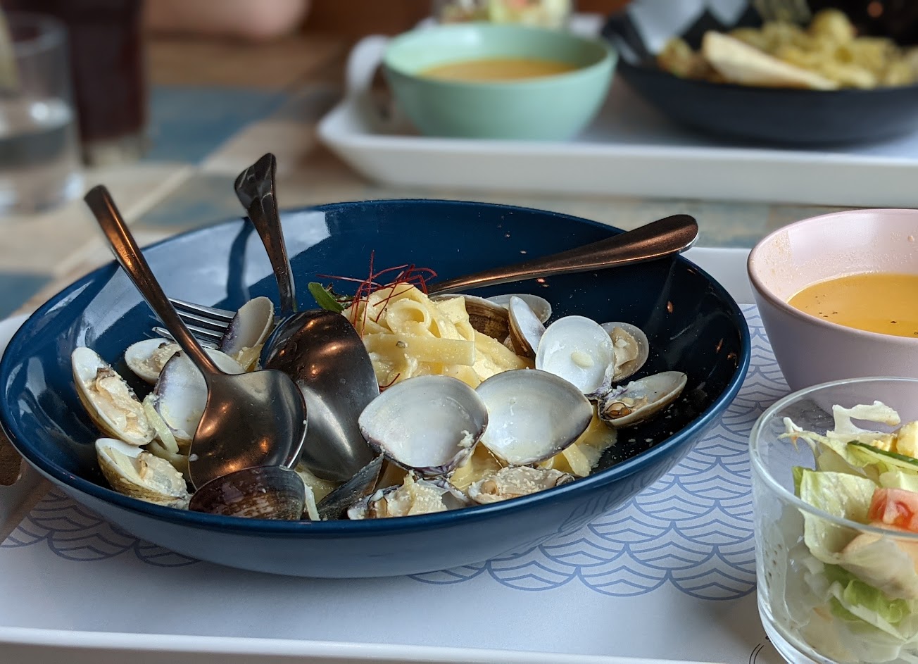 沙拉與濃湯打頭陣,沙拉蔬菜的鮮脆,混搭著玉米與適中的沙拉醬,主菜的打拋豬義大利麵,白酒蛤蜊義大利麵,兩種口味麵條上都有把上醬汁,打拋的微辣感,白酒蛤蜊的鮮甜,美味!南瓜濃湯,南瓜的味道微微沉沉的封在湯裡,就像等待你來發掘般,值得推薦大家嚐嚐