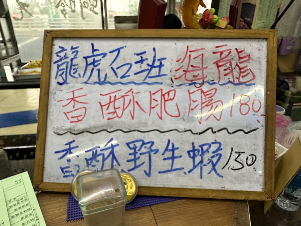 海鮮新鮮好吃,三隻一百的吳郭魚阿爸阿母讚不絕口,但一份200的蝦子雖然新鮮但少了點,炒麵偷加小花枝超級美味。炒菠菜也十分美味一份50元