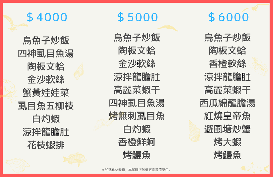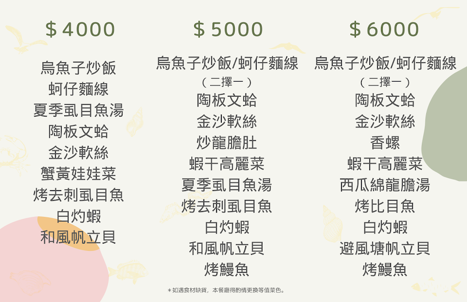 4. 菜色嘛?說特色也好不到那裏!今年漲價了,廚房的師傅手藝可能需再創新!七股海產之名不應只有如此這樣!加油吧!