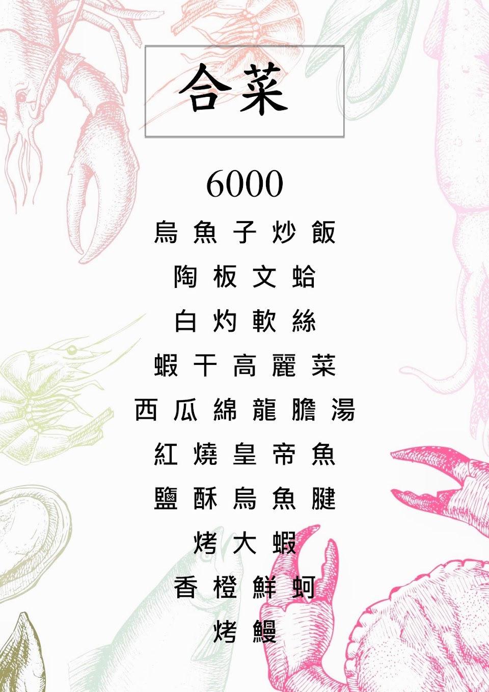 白灼蝦 破布子炒水連 金沙軟絲 虱目魚五柳枝 麻油香煎處女蟳 蚵仔麵線 絲瓜蛤蜊 烏魚子炒飯
