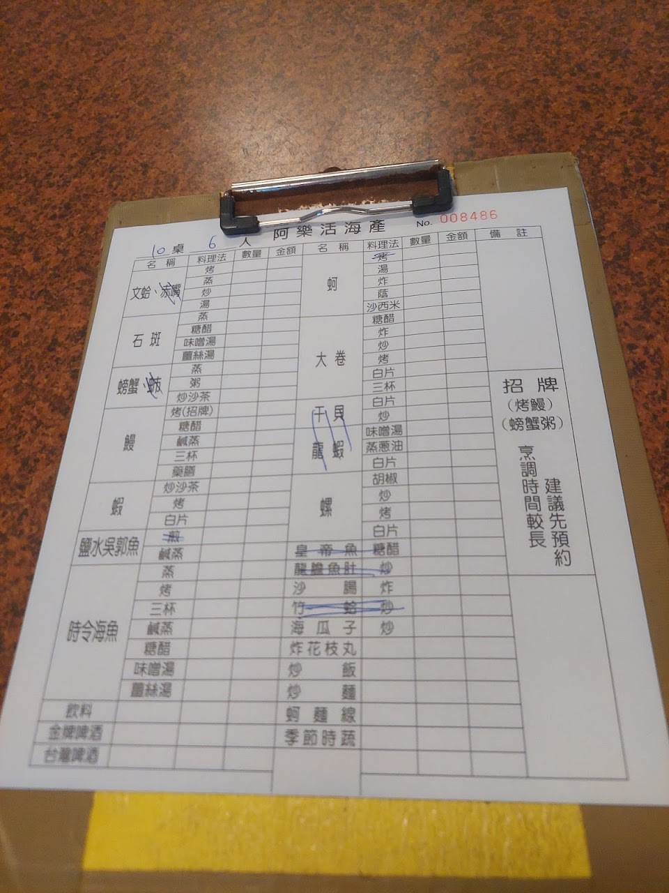 3個大人3個小孩,不清楚份量,蝦2種(斤計價),螺,烤鰻魚(這道不錯,家人喜歡,值得推薦,秤重計價,約1000~),蛤蜊2種,水蓮,炒麵,炸蚵,三杯中卷,上菜速度很快,食材新鮮口味也不錯,依時價,?結帳要有心理準備,我們這餐噴了5張,而這周圍的店家生意都很不錯。帶家人來附近朋友養殖池摸蛤蜊,回安南區前這吃飯試水溫,室內有空調,人很多,所以溫度不算涼但也不至於流汗