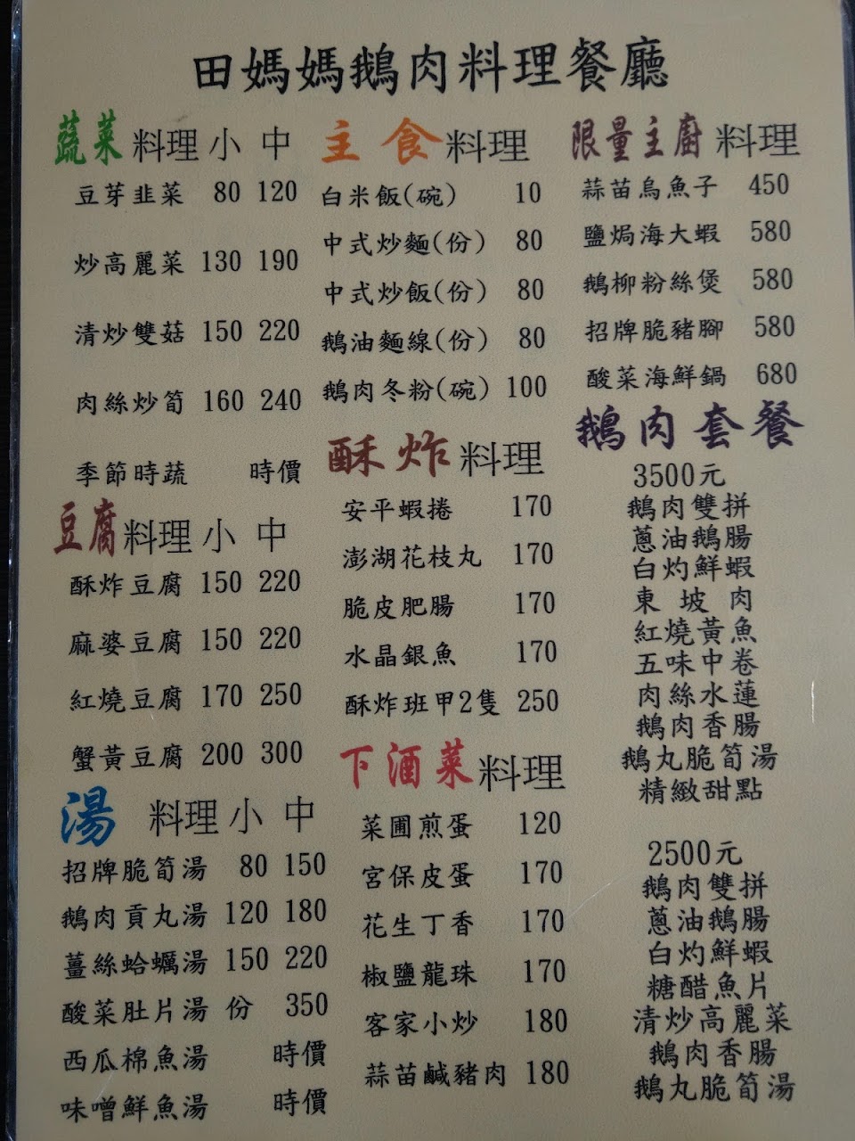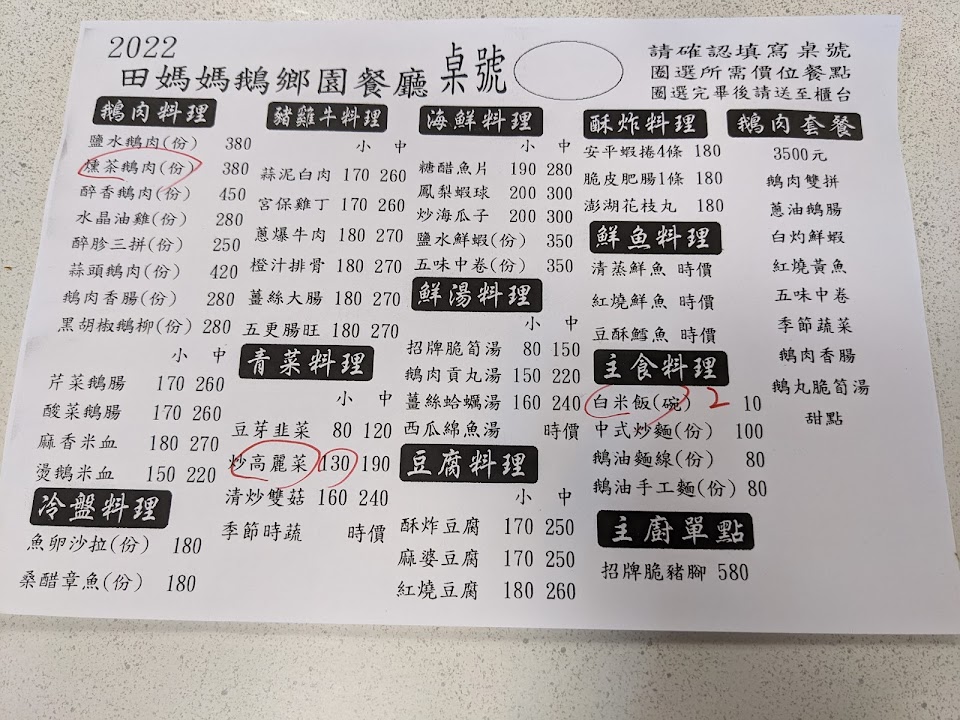 這是一家以鵝肉為主菜的餐廳,也有其他的大菜;因為時間趕且逢大年初三,我們就吃3500元一桌的和菜套餐。 鵝肉及茶鵝確實是一流水準,炒鵝腸及炒水蓮都是水準以上,白灼蝦非常新鮮,糖醋魚也還不差,唯有竹筍湯不堪入口。 總結評分應該有88-89分,再考慮價格因素,可以打90分。 服務 內用 餐點類型 午餐