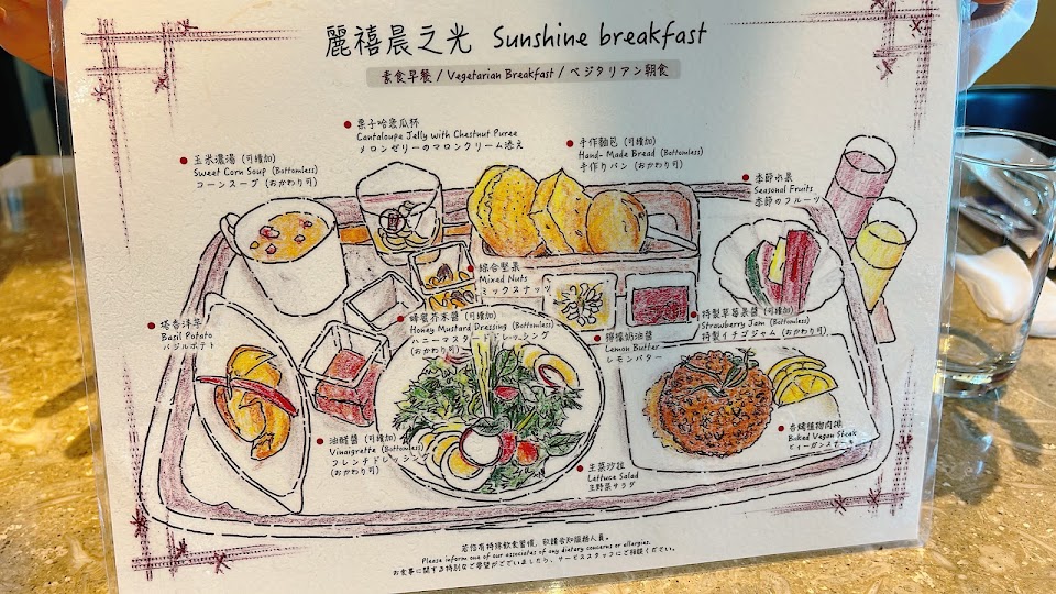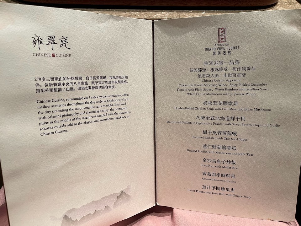 一泊二食的中式晚餐(雍翠庭),配的是$1880龍蝦套餐,看起來精緻,食材是新鮮,但沒什麼記憶點,味道就普通,主菜龍蝦的味道有點失望,如果是新鮮龍蝦真的不需要如此厚重的調味!麵太軟爛!只有覺得季節限定的苦蕎麥茶好喝!但這茶沒有賣,可惜了!