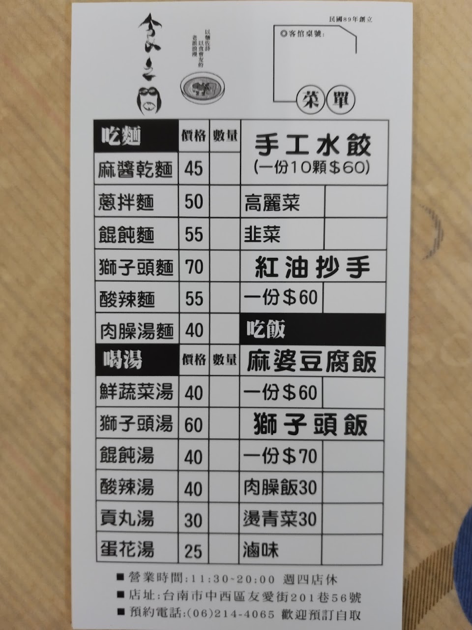 這間搬至友愛街201 巷56 號,店名為食之間,樸實的招牌,但店內的餐點味道很雅緻,點了韮菜、 高麗菜水餃,肉餡鮮美; 麻醬麵味道很溫存、 順口,餛飩味道很特別,有茴香的味道,最重要的是闆娘和老闆親切,已成為我的口袋名單之一喔!