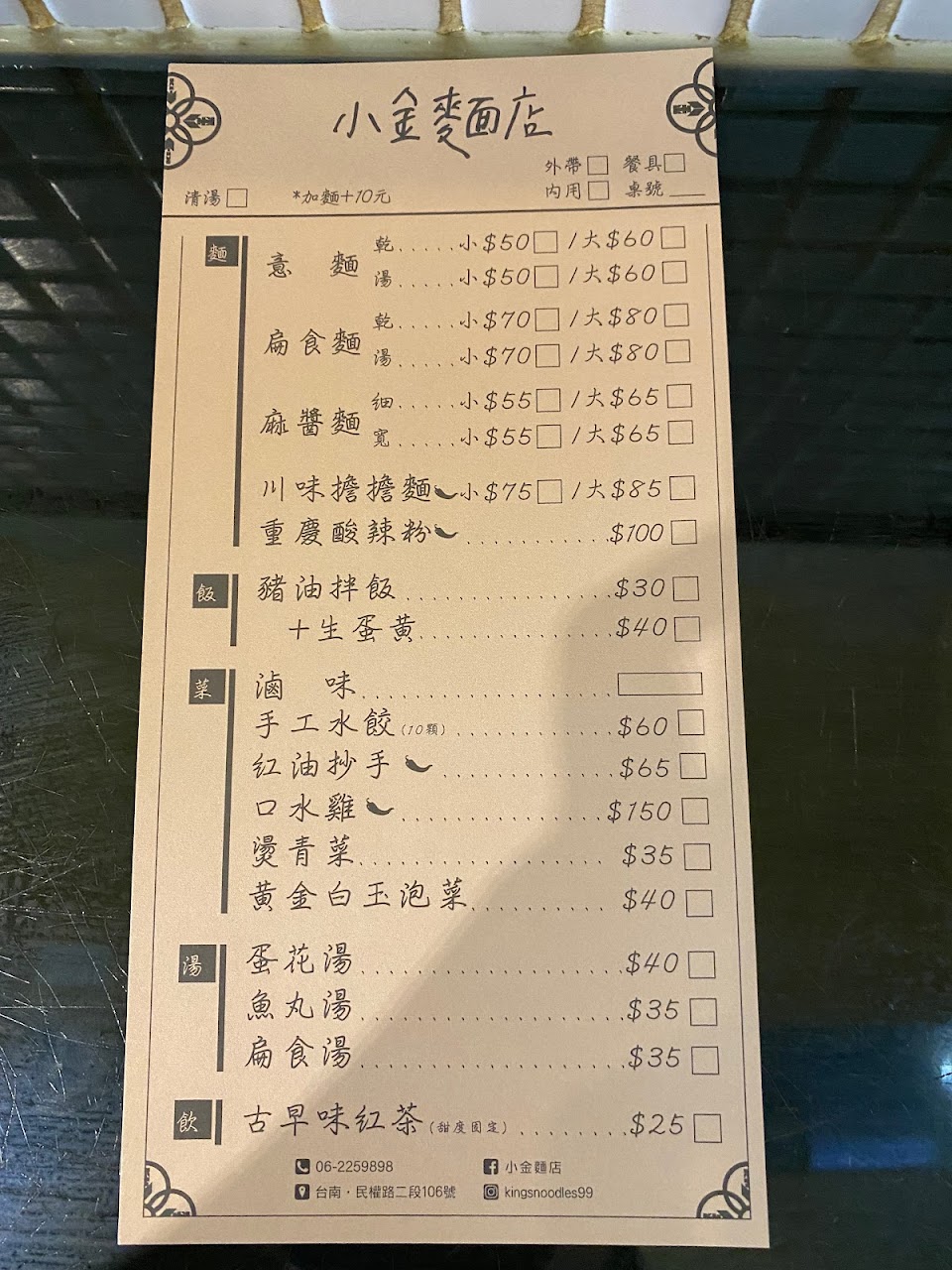 先說結論,裝潢擺設很文青,用餐環境乾淨舒適,但即便沒有上述那些,食物的本質就足以驅動我回訪。在台南説到文青小吃店,葉明致應該是指標,不過小金的麻醬麵跟扁食湯都更勝一籌,尤其麻醬麵的濃稠以及風味層次是媲美老店的實力,寬麵條的選擇也比昨天才去吃的“初麵”的寬麵條口感更好。若不是前面已經吃了兩家店,大概會加點滷味或紅油抄手,只能等回訪了!