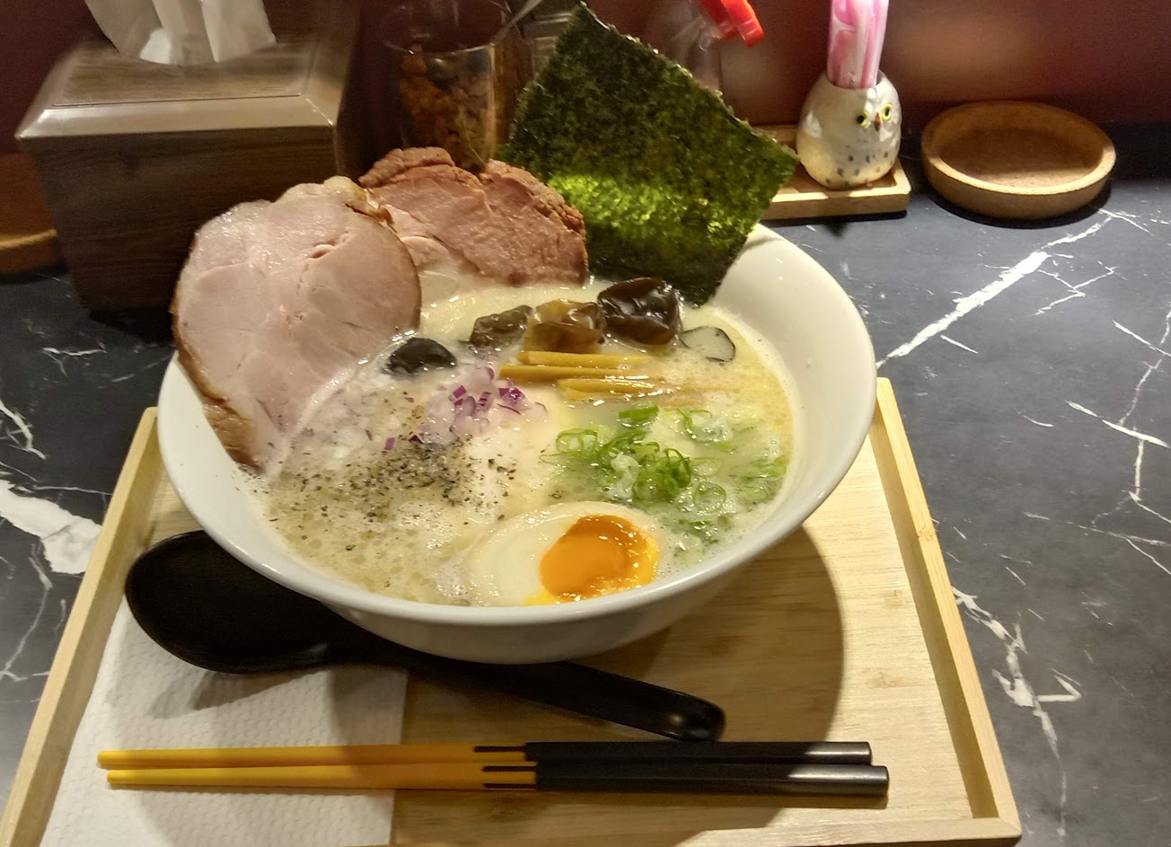 湯頭不錯,魚介風味跟柴魚片搭配很合理,叉燒厚度讓口感更好,還有舒肥(?)雞胸肉也好吃,讓我最滿意的是木耳厚薄度,挑選的木耳吃起來都很Q,又沒有木耳會有的怪味道。