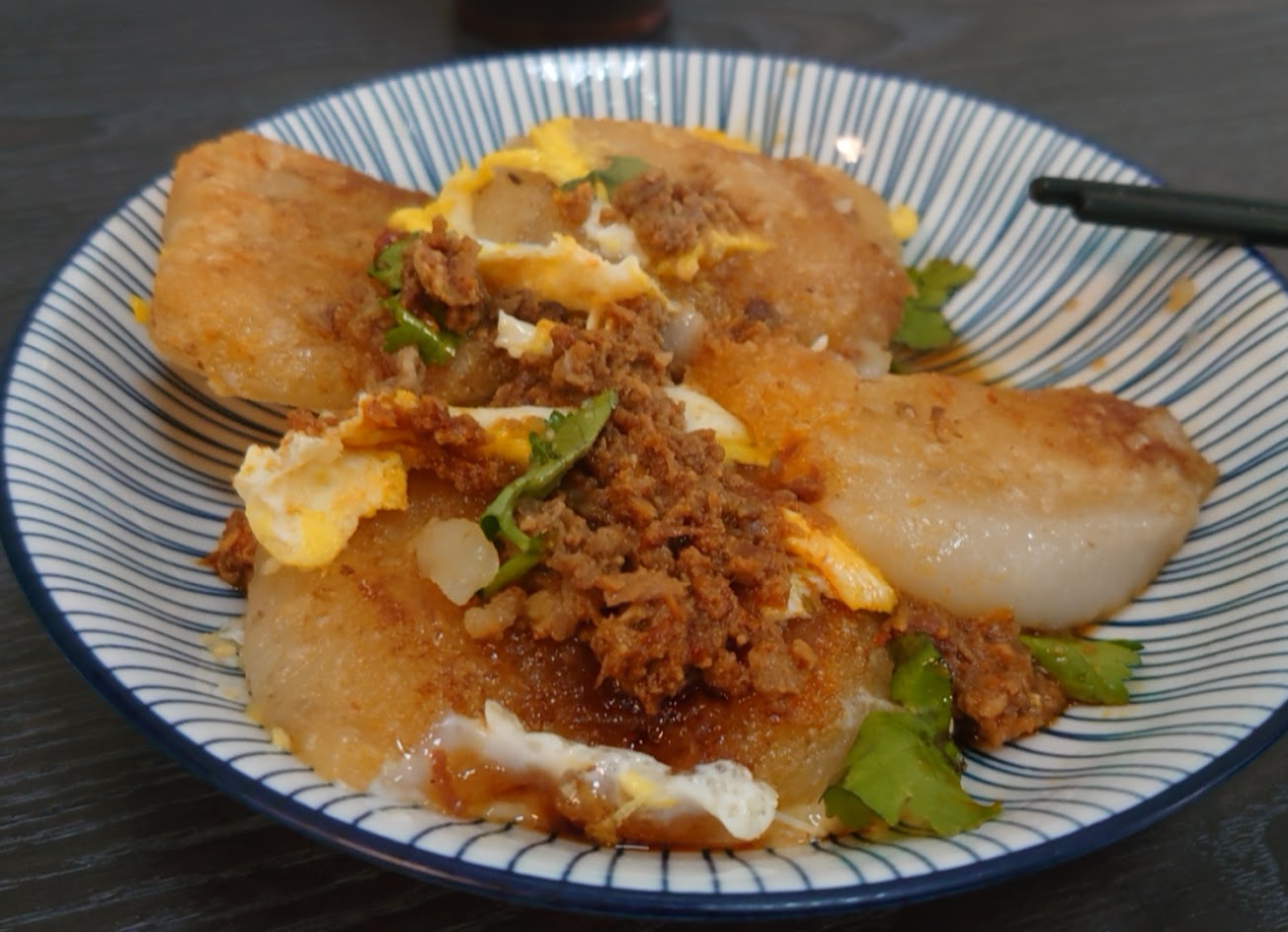 剛煎出來,外層很脆有米餅的感覺,裡面就像碗糕,外脆內軟~配一顆蛋增加滑順感,好吃
