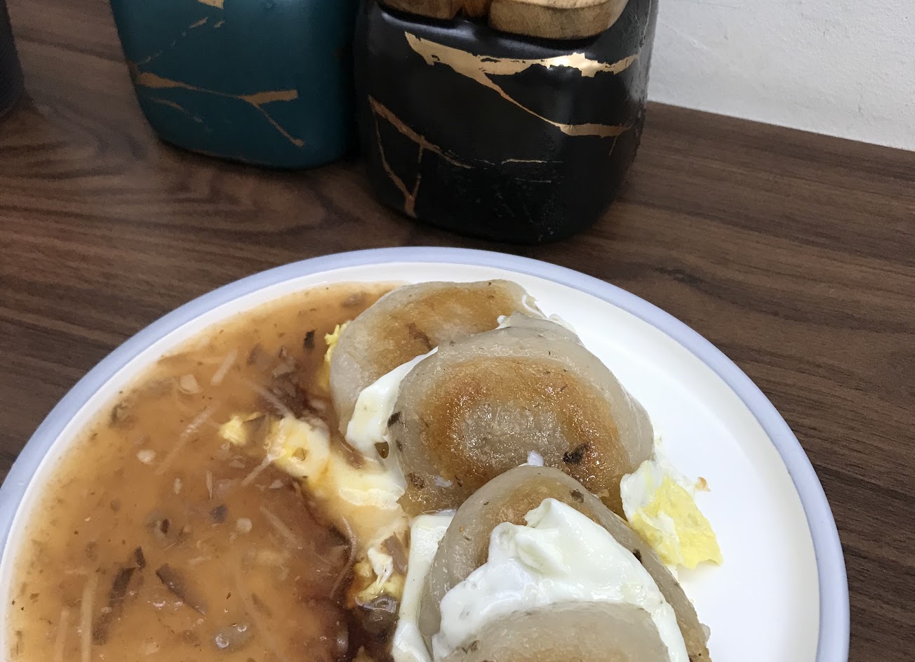 第一次吃到這種食物,它的軟硬度口感介於蘿蔔糕、碗粿,和「蒸肉圓」的皮(把它想像有厚度)之間,我點的是原味加蛋,即便放一陣子再吃(剛好讓醬汁入味)也很好吃,粿一面煎得香酥,一面巴著荷包蛋,淋上醬汁拌著肉燥,蠻美味的。