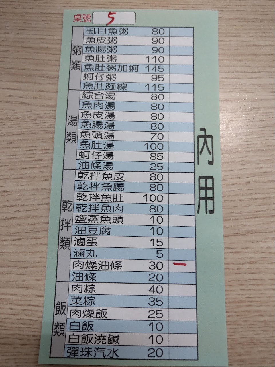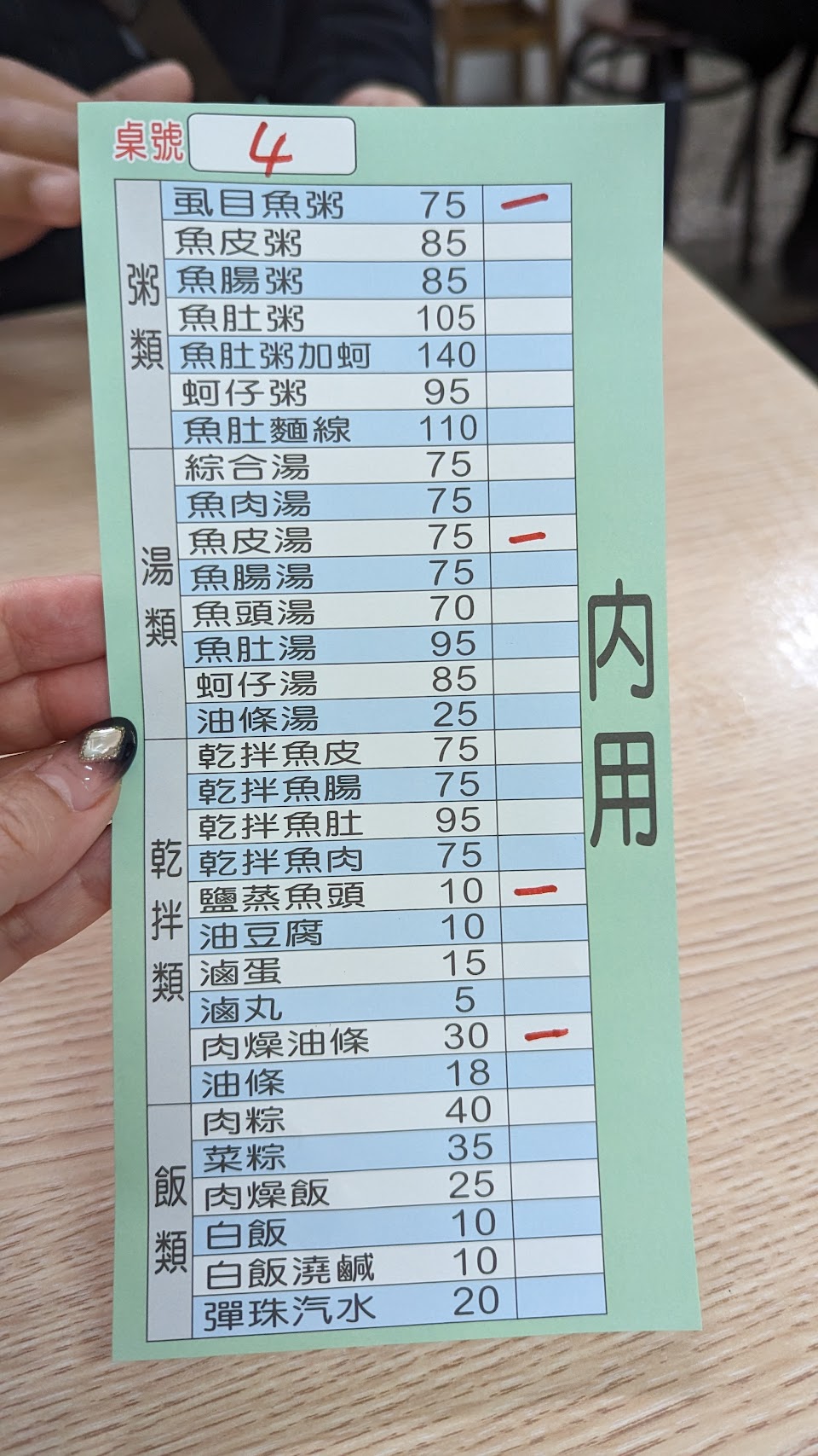 個人覺得餐點跟價格都很可以,虱目魚肚粥的魚肚是整片的,雖然不是頂大片的,但跟其他名店相比,還是覺得超值。