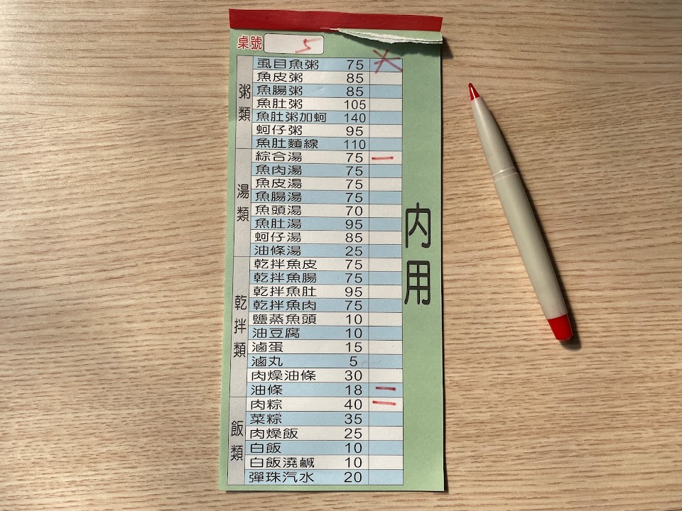 整體表現真的好吃 推薦 魚皮湯(超清爽魚湯) 魚肉湯/魚肉粥(料多超便宜) 滷丸/油豆腐/滷蛋 南部口味(甜) 肉燥飯/白飯淋鹹 普通 可以不點