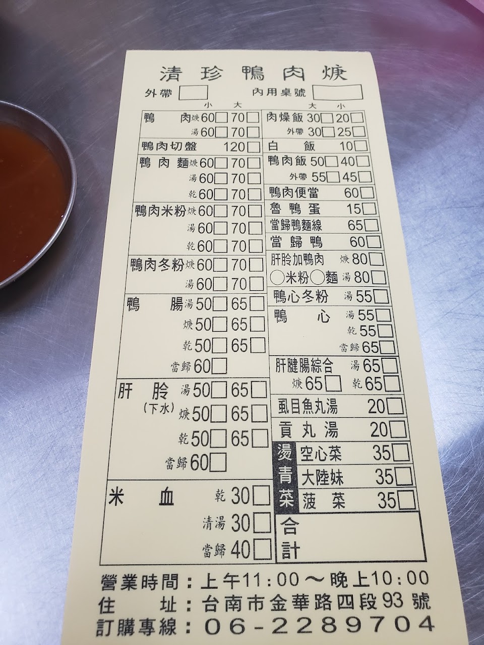 湯頭滋味好,鴨肉很好吃,價格也不貴。 雖然營業時間到23:30,但22:00開始陸續有些品項賣光。