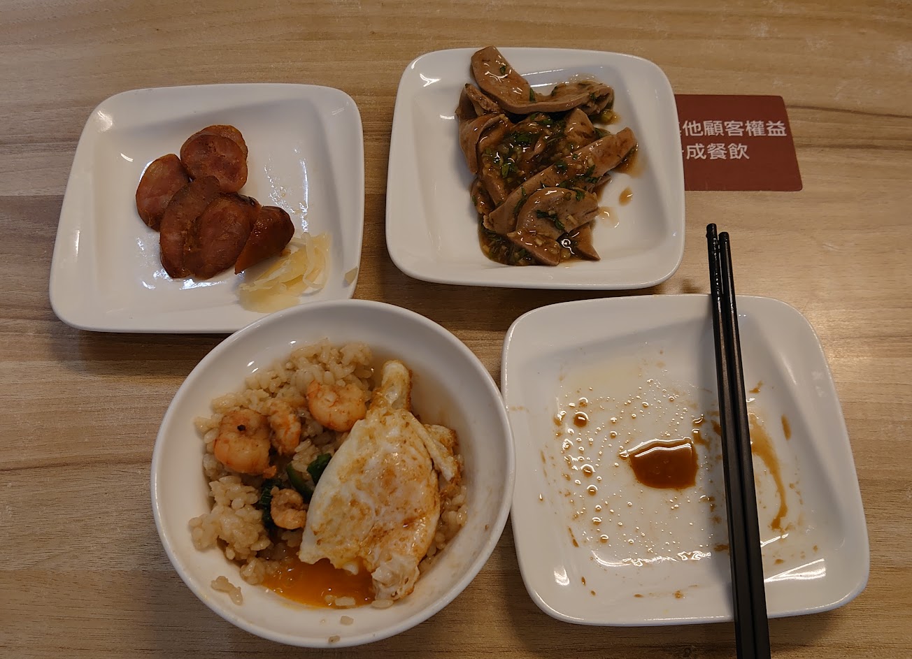 蝦仁飯好吃,但是蝦仁有點少,環境對小吃店來講算是不錯,送來的香腸卻是冷的⋯⋯沒有香腸烤的香味
