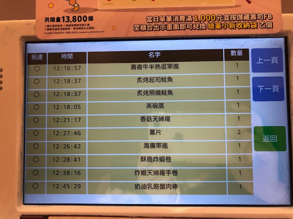 看到可以抽蠟筆小新的扭蛋 就臨時去吃藏壽司 點了8種壽司(10個盤子) 抽獎兩次都摃龜 (5個盤子抽一次)