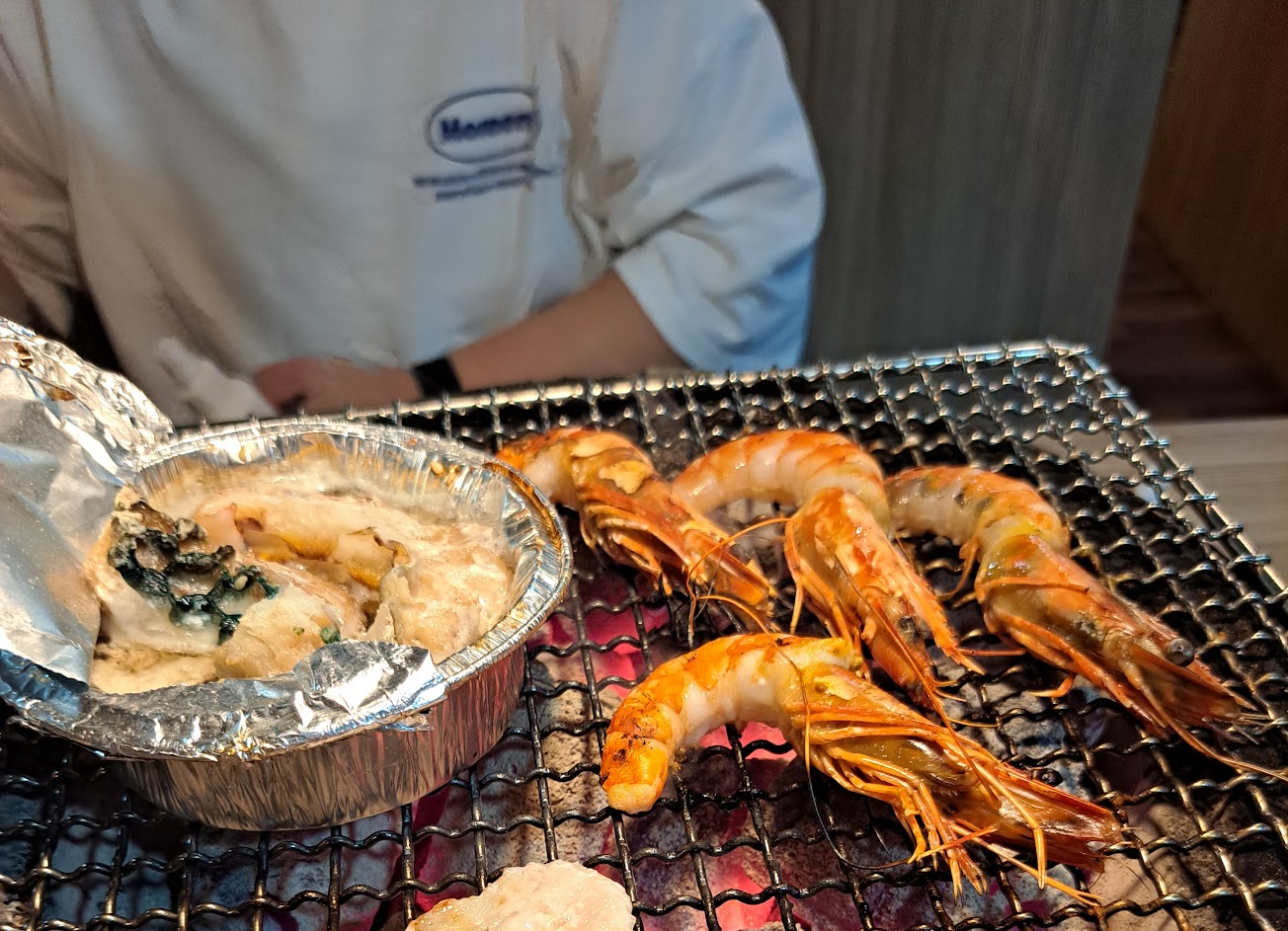 服務人員態度親切,烤甜點挺專業的,甜點選擇也很多,價位親民菜色多樣,但是環境太熱可以改進,烤爐真的太熱,生蠔烤的時候會噴汁,工作人員可以事先告知,肉質普通,蝦子好吃,但是會壓量,不會一次上太多。