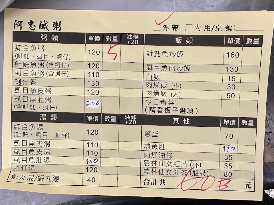 阿忠魚粥是做了41年的老店,一碗綜合魚粥$110 裡面是滿滿的魚肉蚵仔,湯是古早味的湯頭,再配上一杯仙女紅茶,更是絕配!