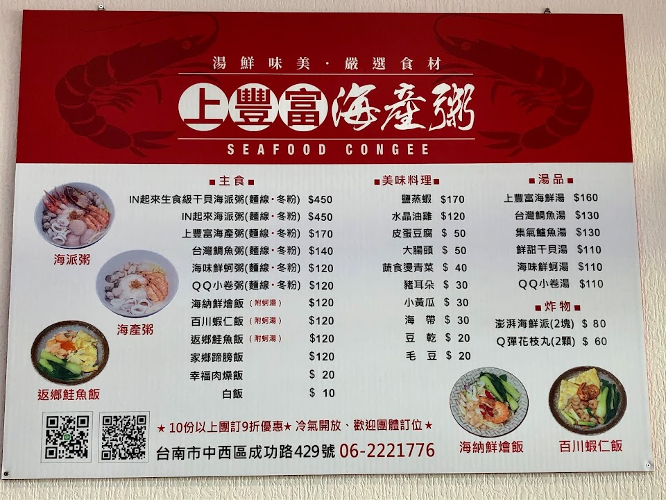 口味來講是不錯的,尤其是台南流行飯湯,難得有生滾粥的選擇!可惜價位真的稍微偏高,以180的選擇來講,粥的量真的不算多,蝦子給的量倒是還行,炸小卷還不錯