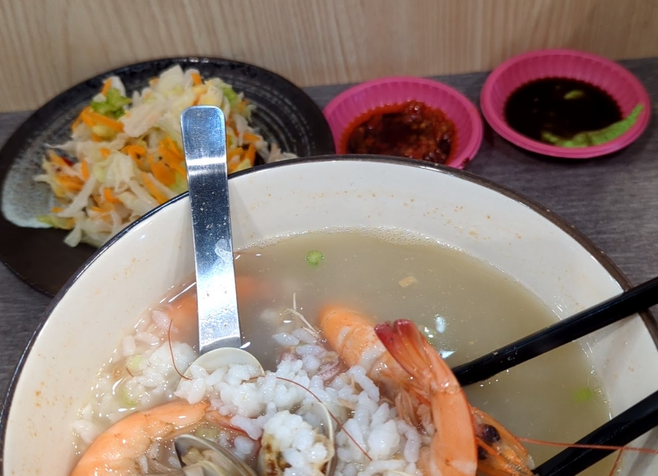 海鮮粥的湯頭很鮮甜,店家用料大方,蝦子都很大隻又新鮮,CP值超高,另外店員們都很客氣,服務態度很好,吃得很開心。