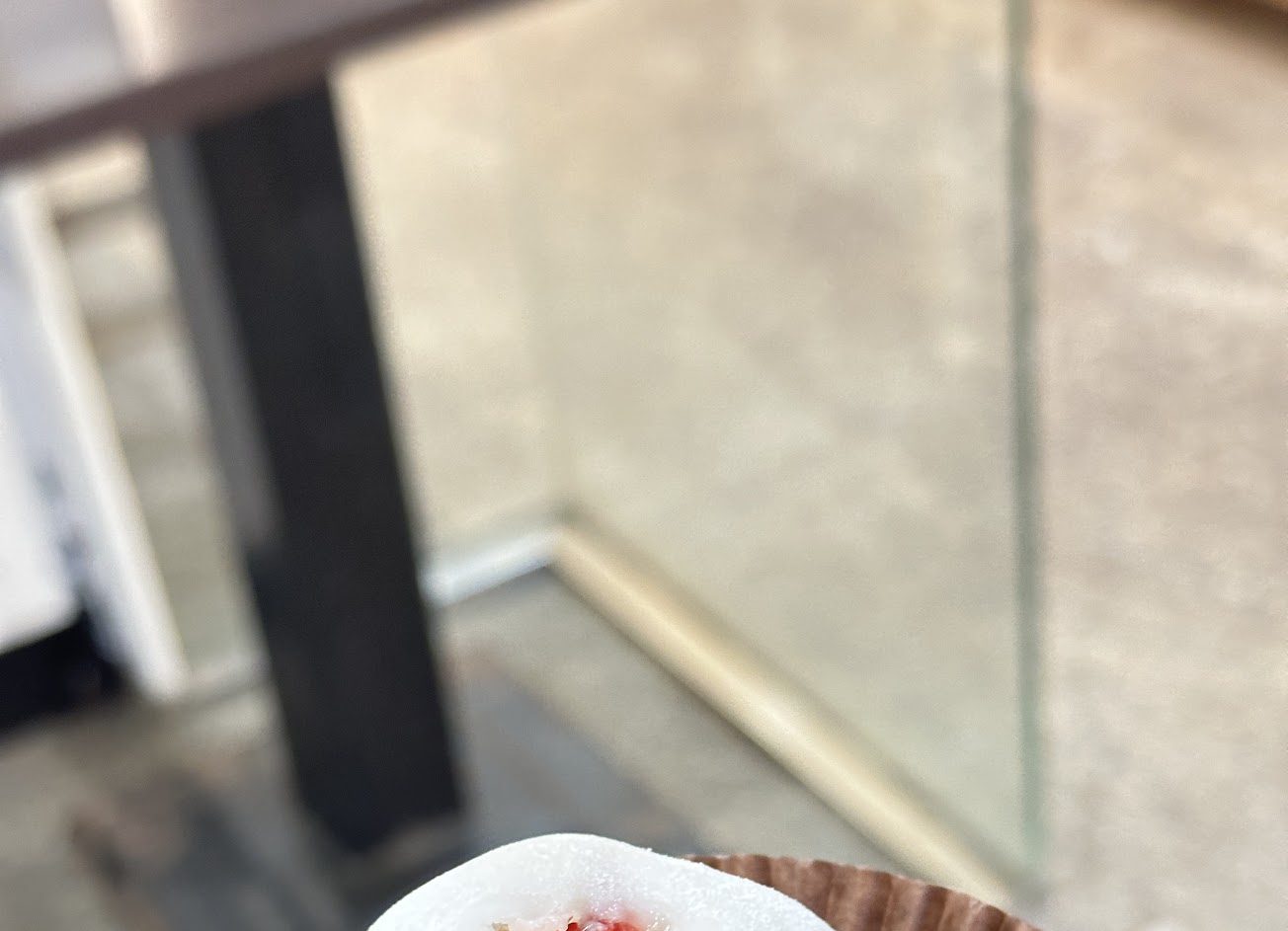 芋泥草莓大福,芋泥不算太多,但草莓是一整顆的而且皮蠻Q,整體口感還不錯。 門口有板凳可以坐著休息跟吃大福很貼心!