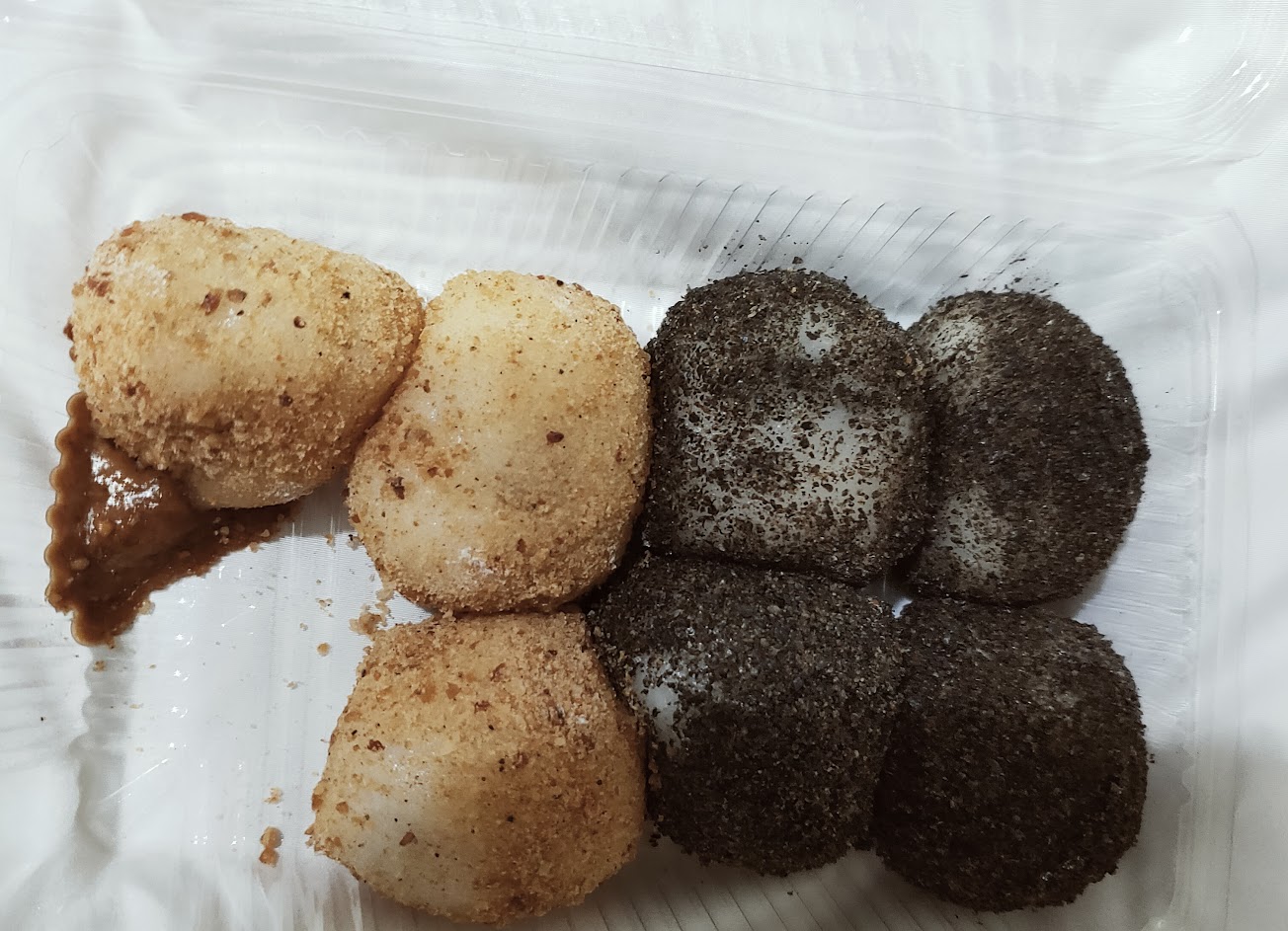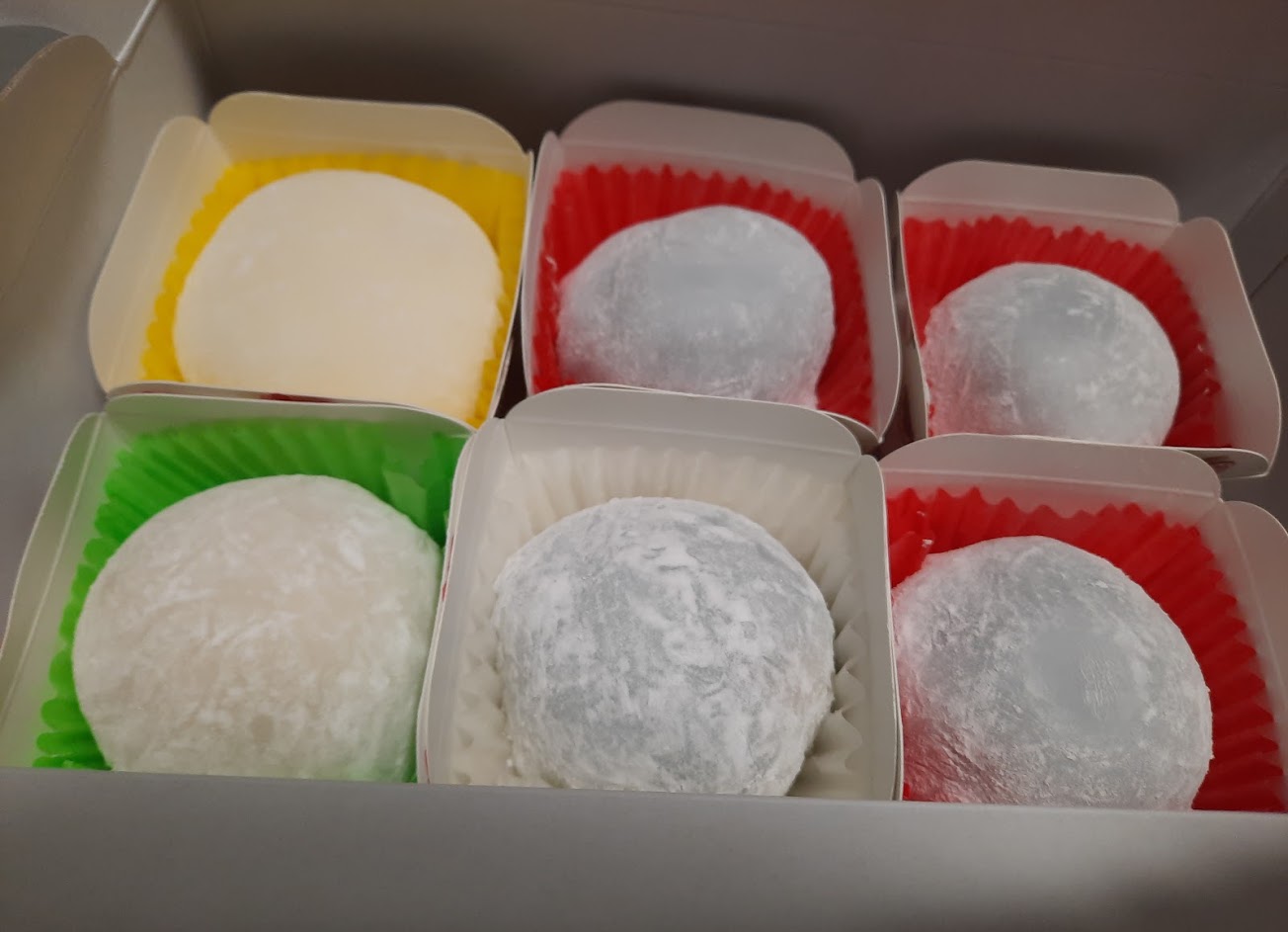 普通麻糬口味有花生芝麻紅豆綠豆奶酥抹茶芋頭,一個10元。奶酥的外層有一點點椰子,花生的內餡是順滑花生醬,紅豆綠豆內餡都是沒有顆粒的。一口一個很剛好的尺寸,嚼勁黏性甜度都比我吃過的麻糬少一些,可以說是舒服清爽感的甜點。