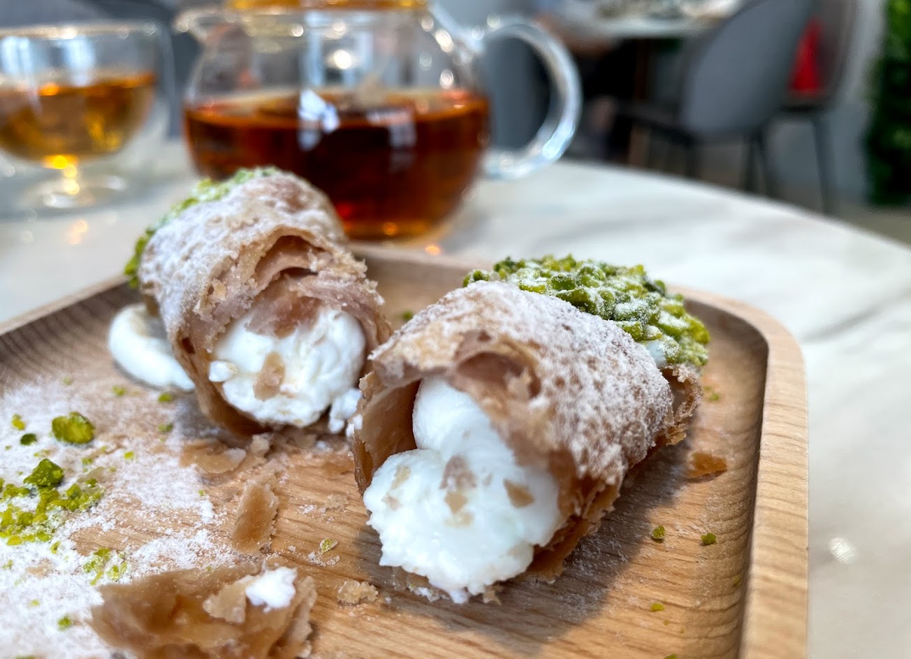 卡諾里捲心酥的皮酥脆而不油膩,內餡的cheese乳霜柔滑實在,不會有過多空氣感,亦不甜膩,蘸上新鮮翠綠的開心果碎,香氣十足。