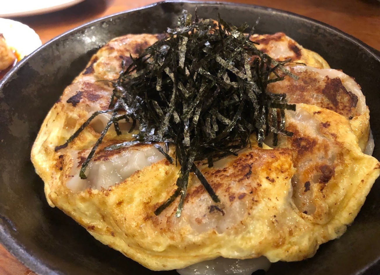 不同於台灣傳統的,覆蓋了一層蛋皮,並且加入海苔絲做為調味,水餃本身是韭菜豬肉