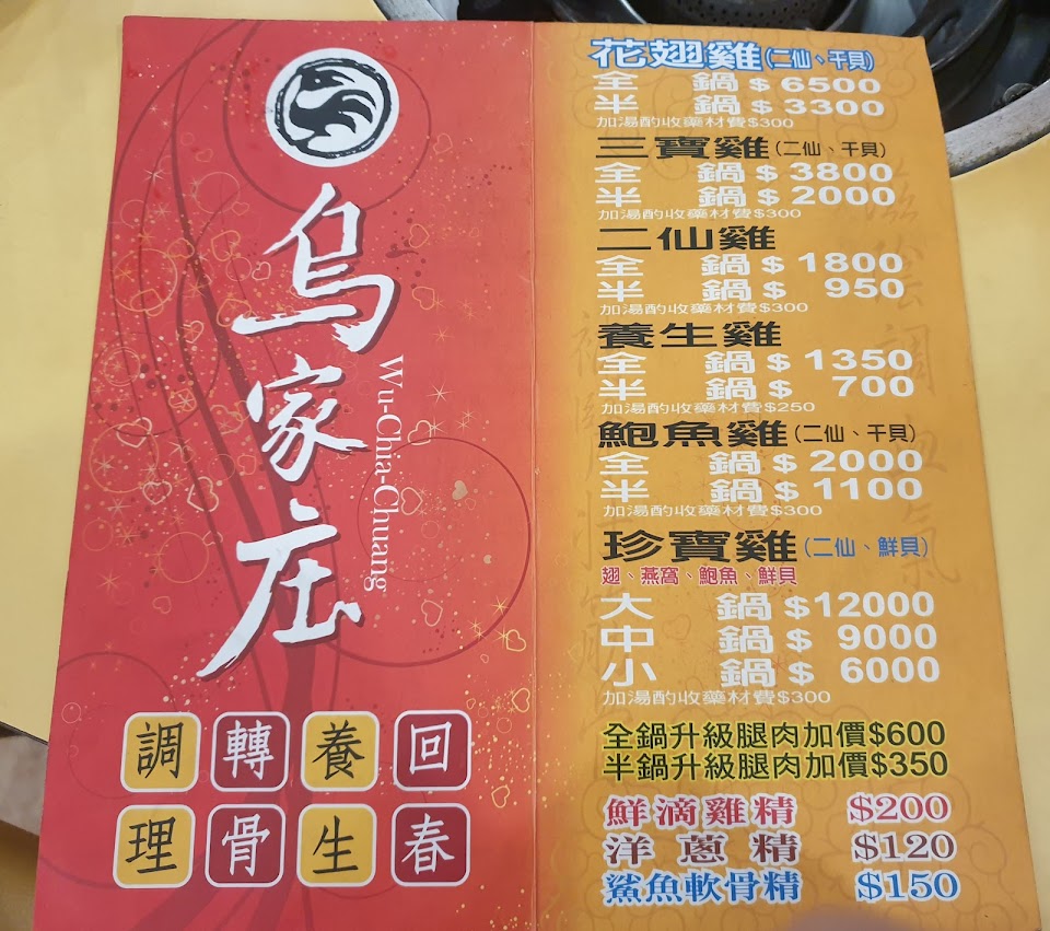 烏家莊養生雞鍋……秋冬進補的好地方……PS:但服務人員會小小聲’聲稱問你要不要換成腿肉只剩下最後一份~變相推銷(結果後面進來的客人都以同樣話術推銷換腿肉成功~就是她聲稱的最後一份腿肉有N份)然後買單時會發現帳單上多了一筆:+4的記號也就是被多加了400元……這點讓人感覺很不舒服……而且換成腿肉吃了幾塊就好膩喔……