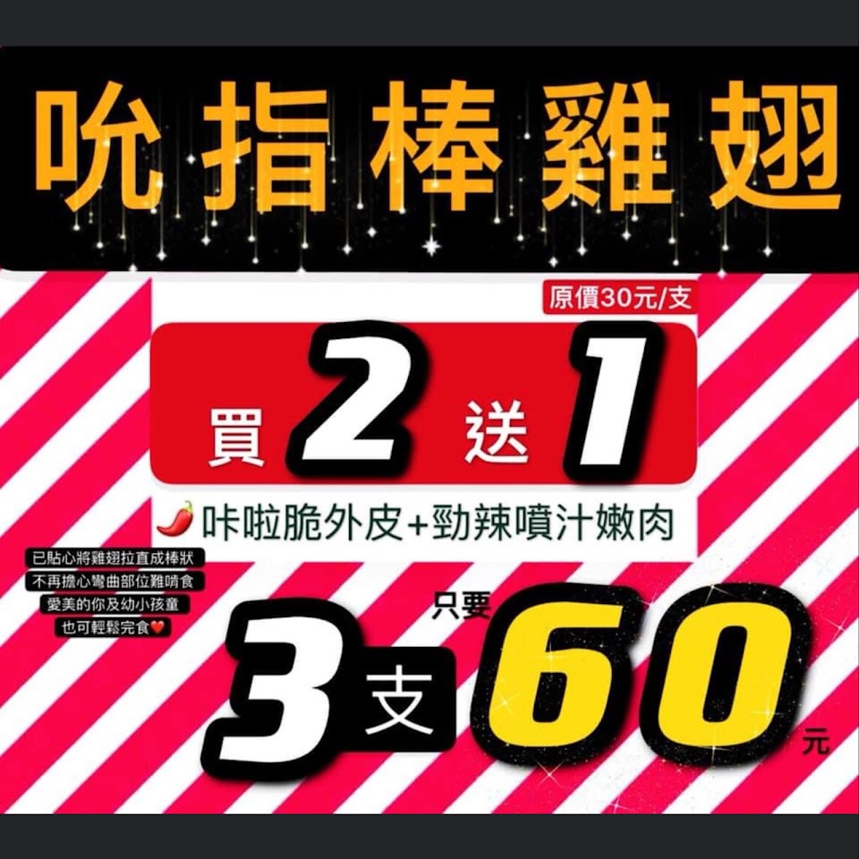 ✨#雞翅 單支30(來店買二送一,三支60元)肥厚大隻!鮮甜的雞汁 辣度剛好~是咔啦雞外皮(串成直立式)很好咬,?炸地瓜 大份$50(撒甘梅粉)香甜酥脆。