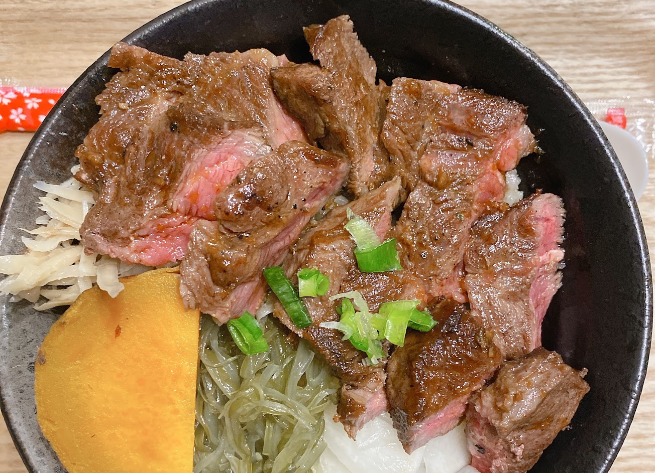 點了牛排丼和骰子牛丼,牛排的熟度約五分熟、骰子牛熟度約七分熟,配菜的地瓜、牛蒡絲、海帶、醃蘿蔔都表現得很不錯。