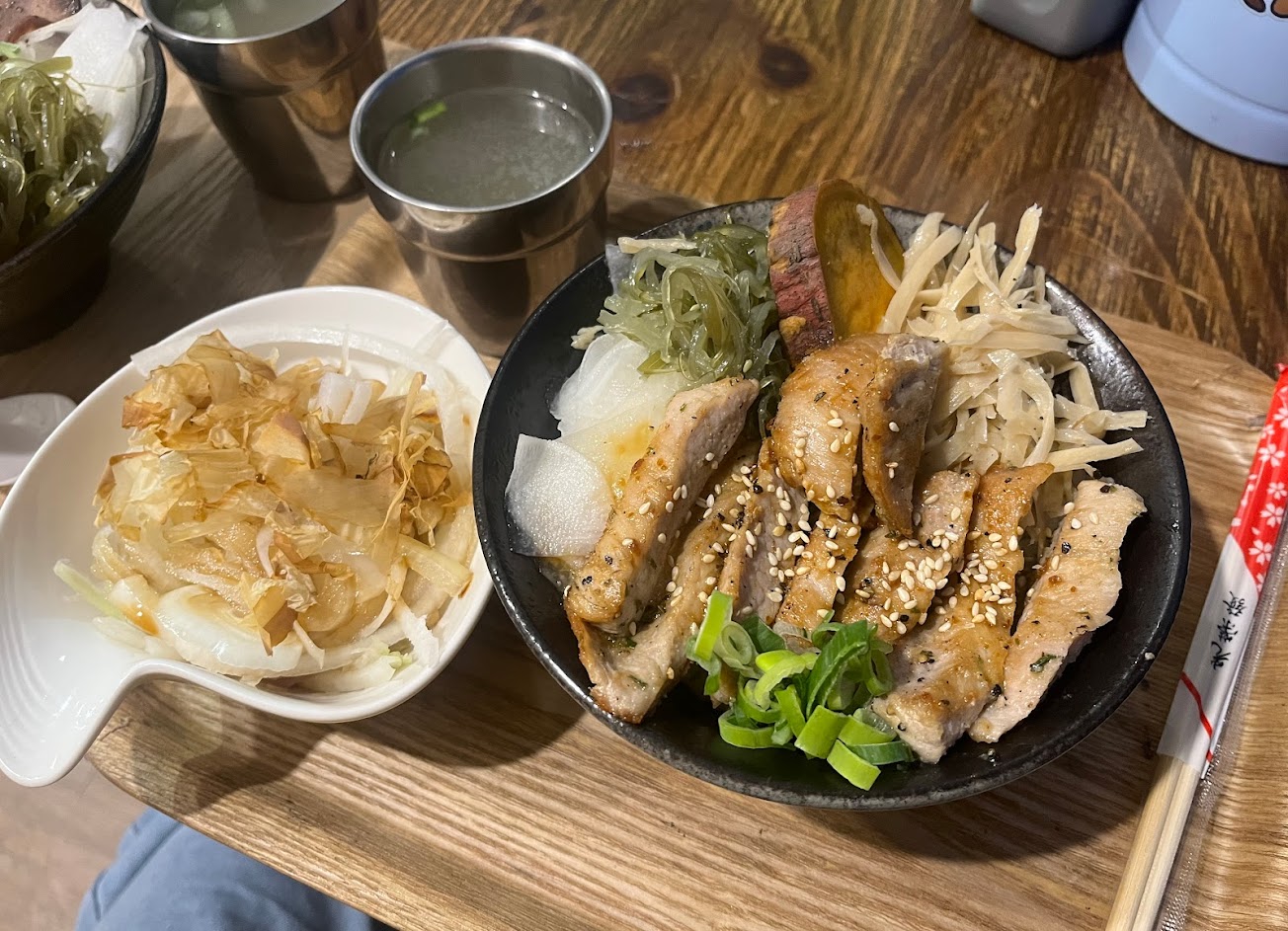 打卡送小菜 好吃的松阪豬丼飯跟厚切牛排 松阪豬咬勁 牛排些微的筋 飯量不少,醬汁很香 配菜有海帶絲、醃蘿蔔、牛蒡、蕃薯 味道都很不錯 附贈的熱湯也不馬虎