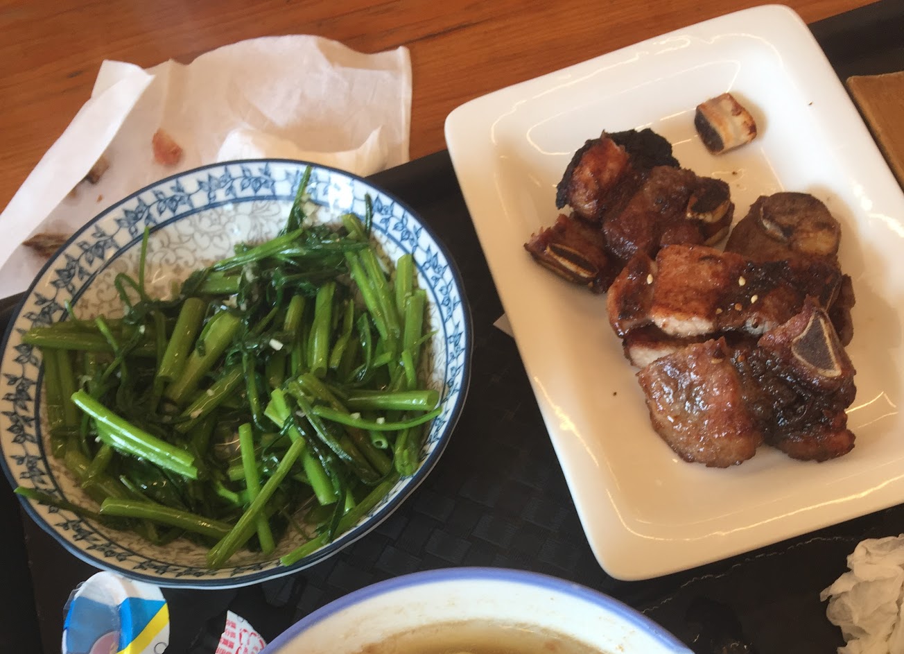 豬油拌飯尚可,點了一盤燙青菜,但有半盤是很像蔥的東西(蒜苗)。店內座位太多沒有動線,我六月來吃店內好熱無冷氣,連電風扇都很微弱,邊吃邊冒汗。魚丸湯滿好喝的。
