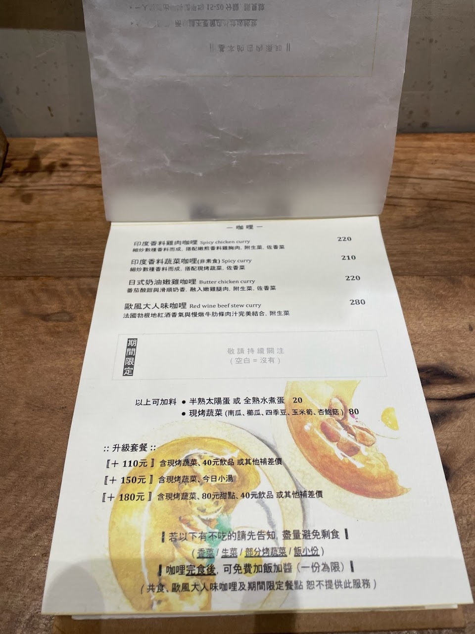 菜單上主要分日式與印度咖哩,搭配不同主菜。