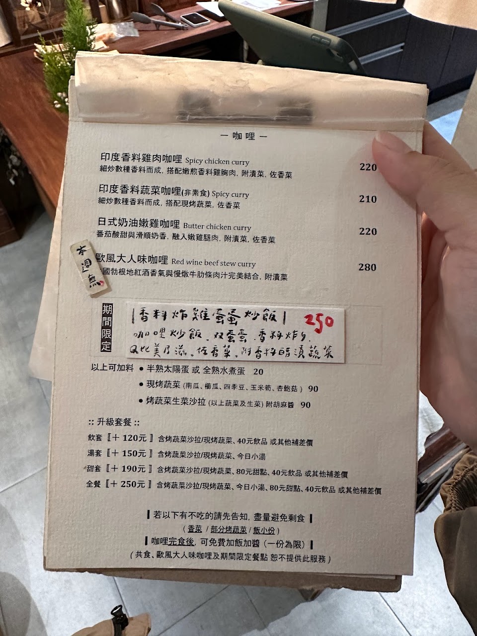 內部空間非常美,點了日式奶油咖哩真的很好吃,加點了套餐每樣也都很棒,烤蔬菜非常鮮甜,高山茶也很好喝,可惜忘記自己還有磅蛋糕還沒上就離開了,十月會再來試試紅酒燉牛肉