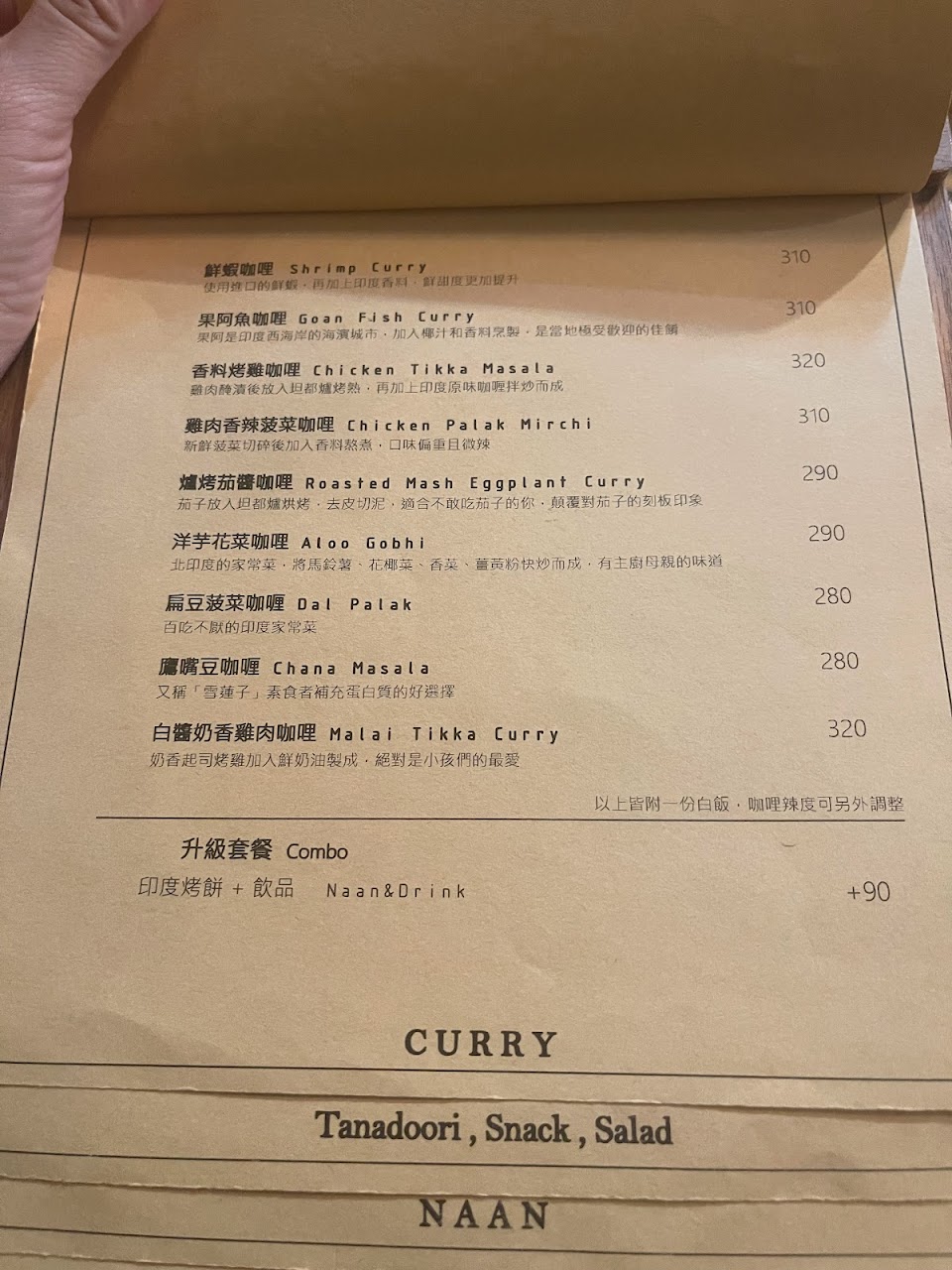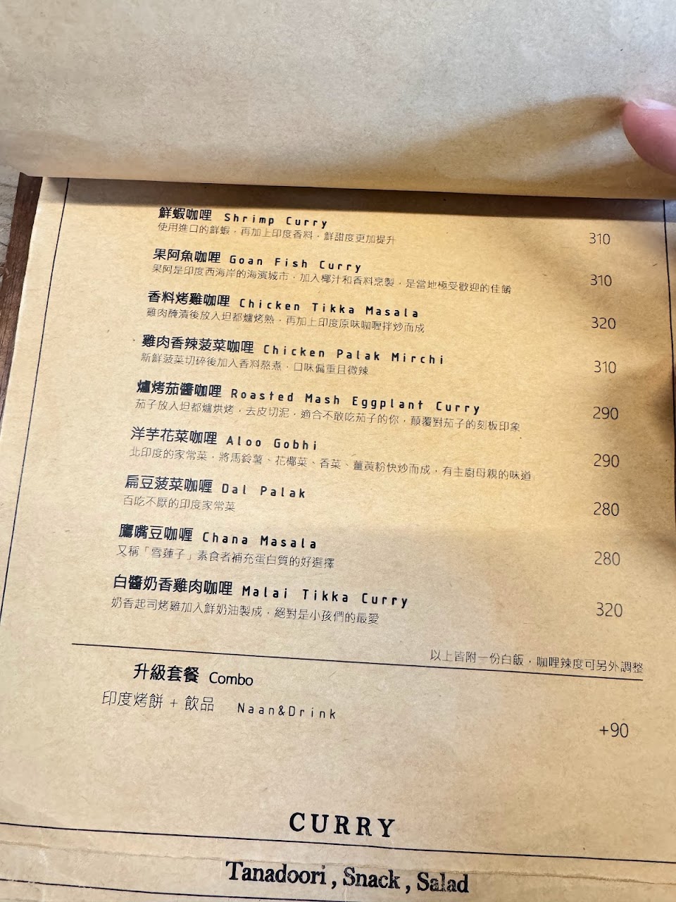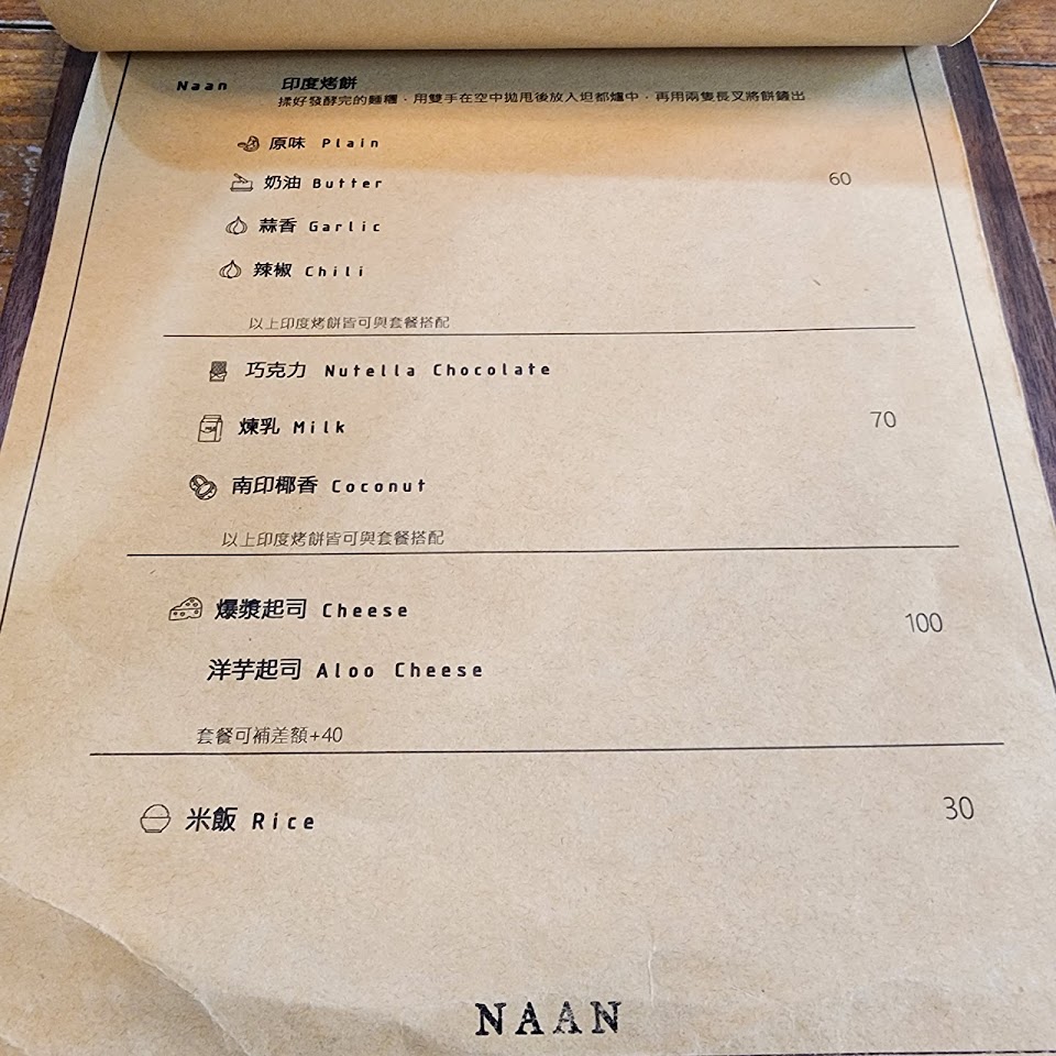 菜單上分成可自選口味和主廚搭配的咖哩風味,也有其他小菜可供選擇,原則上價差不大但不同種類的咖哩,味道吃起來有蠻大的差異,可以依自己需要