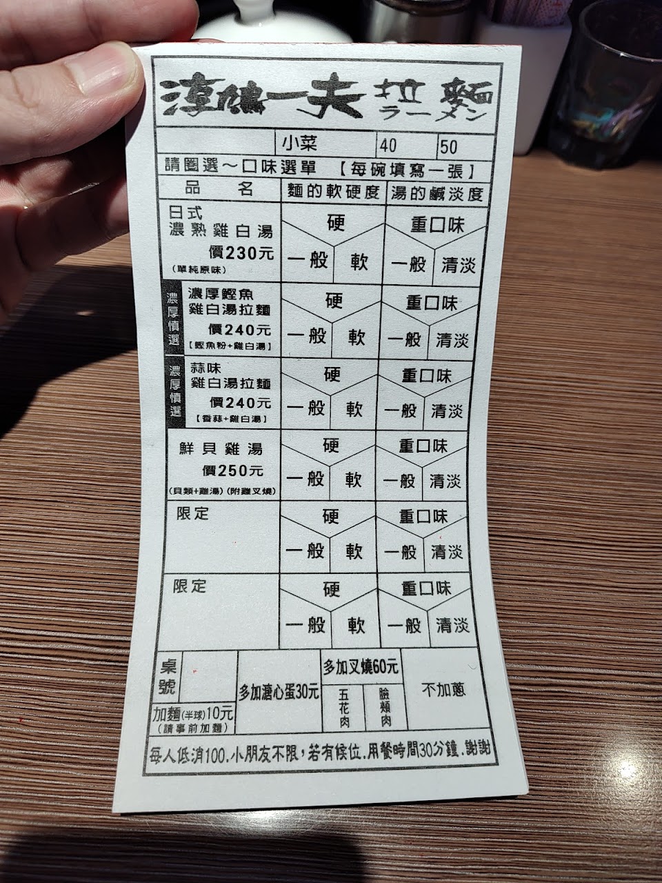 ?選擇:麵:硬;鹹淡:重口。