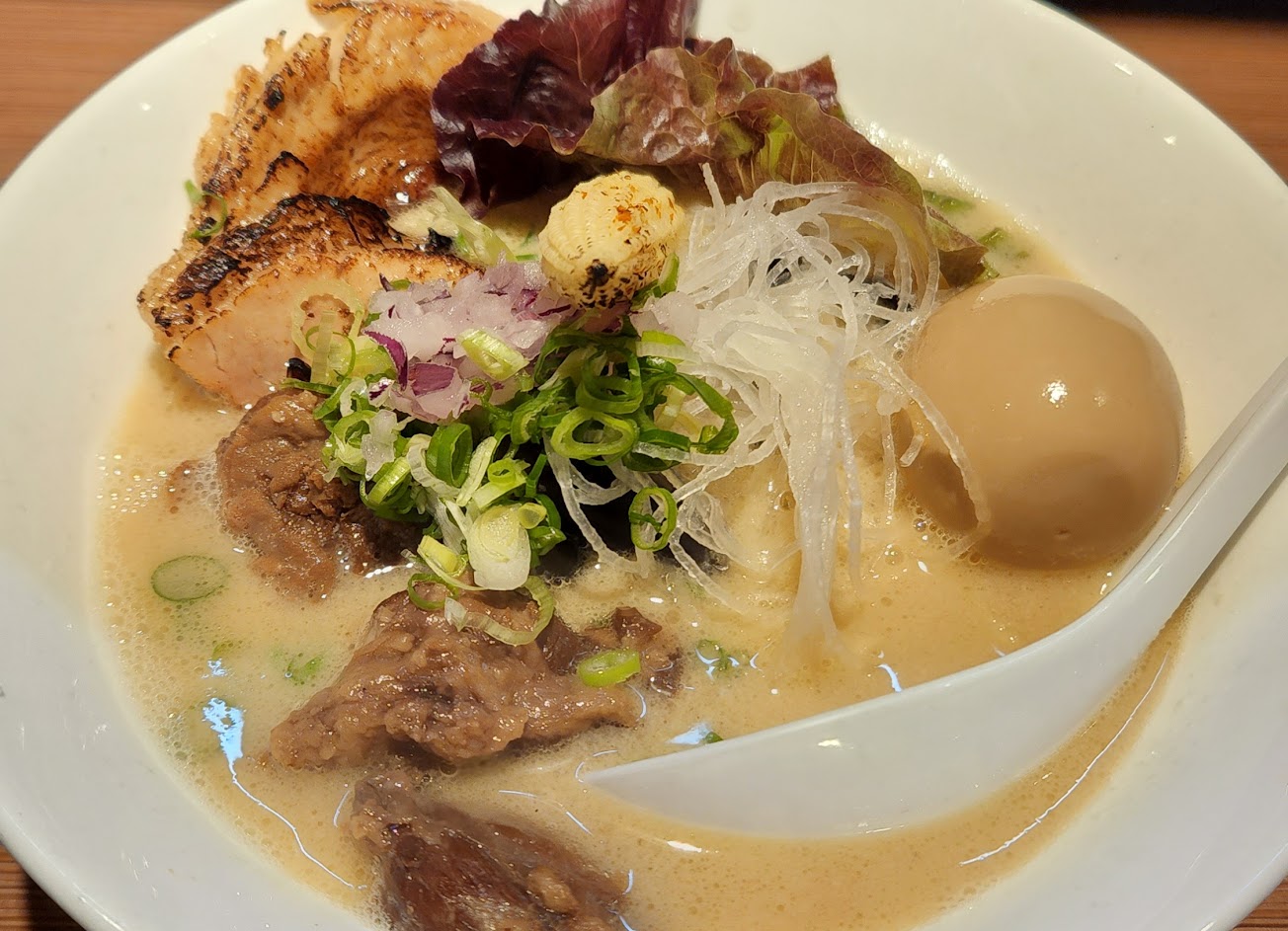 推薦的朋友說雞白湯好吃我才來的,可惜本次來訪無法選擇這項,店家告訴我只有鮮貝雞湯($250)可選。 個人感覺:厚切肉片的肉質不錯,新鮮味清;溏心蛋好吃,不過整體偏軟;湯頭我選一般,香氣口感稍嫌清淡,像黃麵的麵條沒什麼吸附湯汁,若配湯一起吃還可。 以同等價位可以在台北吃到整體不錯的拉麵。