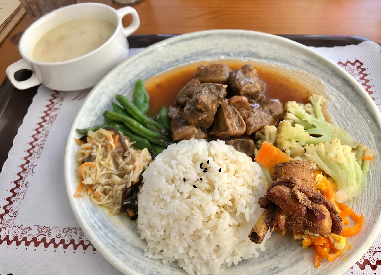 簡餐附贈的玉米濃湯是涼的,反應後有跟我們說有需要可以幫我們加熱⋯所以是有加熱再送來!椒麻雞上面淋的醬汁不是酸辣汁,是洋蔥加青蔥加醬油的汁⋯這個很不對味,就是適合沾醬油!但豬排的肉跟椒麻雞的肉質是不錯!冰淇淋的品牌口味上還算不錯!室外空間很大,位置多,但蒼蠅很多,不會再光臨!