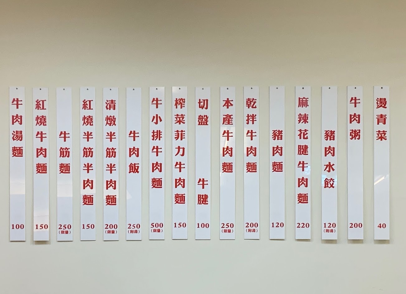 菜單都在牆上,直接和服務人員點餐,餐點單價稍高,但生意一直都很好~環境乾淨整潔,用餐時很舒適 嘗試了紅燒半筋半肉麵,肉燉的軟嫩,有請老闆麵量減半,但不管是肉還是麵整體份量都不算很多,而且麵體不太吸附湯汁,感覺有點各自表述,但湯頭清爽,喝完不會口渴。小菜表現中規中矩