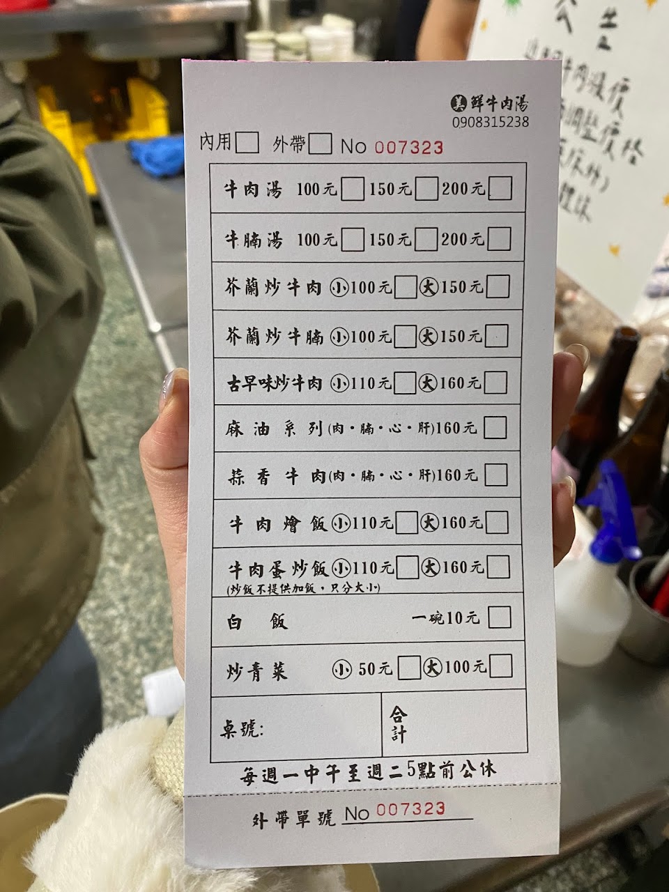 蒜炒牛肝、牛肉很好吃、份量不多,牛肉湯整體普通,店內沒有冷氣、夏天的台南真的蠻熱的,附近不好停車、騎車會比較方便。