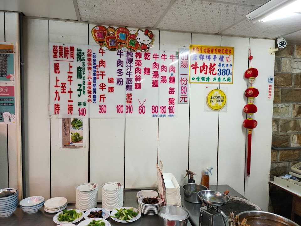 多年後再次光臨 因為老婆沒吃過? 星期天晚上生意非常的好呢 幾乎客滿! 以前半筋半肉麵是250元(遠目…… 所以現在就點一碗牛肉麵&一碗牛肉湯麵這樣balance一下~然後自己告訴自己是點了兩碗牛肉麵? 還有我謹記這朋友告誡 千萬不要點滷味~ 用餐時聽到別桌結帳時都是幾百幾百起跳的??? 所以來這兒吃個牛肉麵就好 牛肉塊真的好吃 加些酸菜和辣椒後整碗味道更濃 更不死鹹 是可以為了牛肉麵再光臨的~