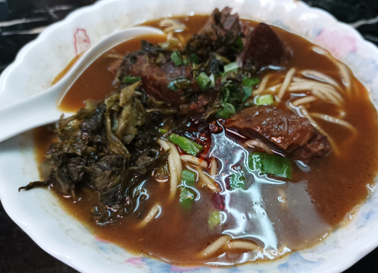 牛肉麵是細麵沒彈性,湯頭是沙茶,就是一個怪