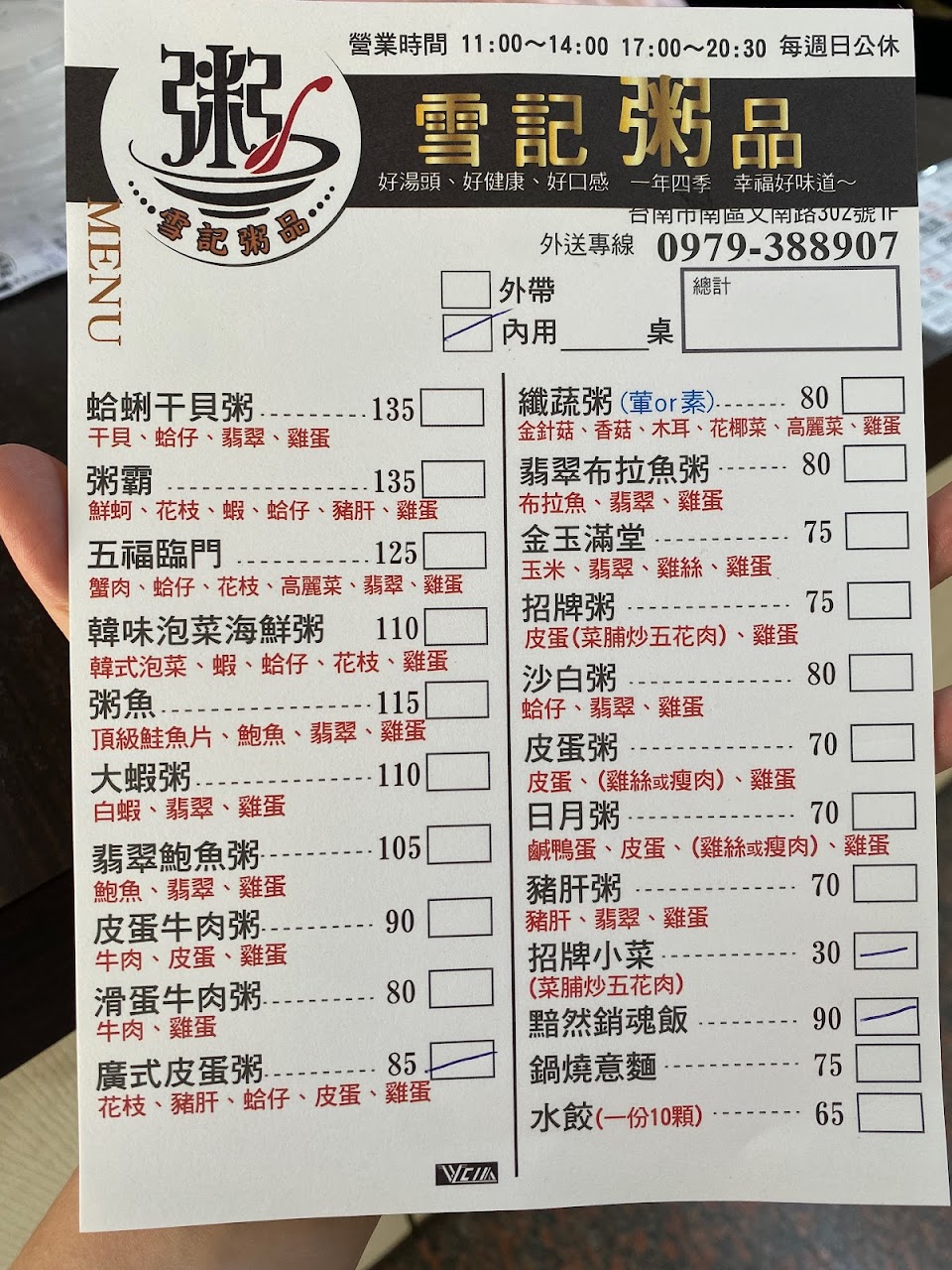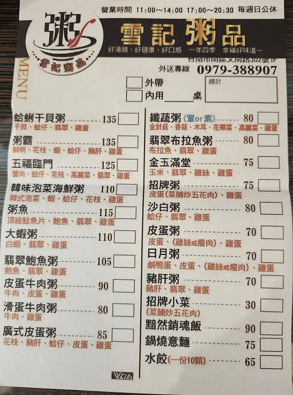 2024最新在地推薦餐廳的菜單_雪記粥品店的菜單、圖片