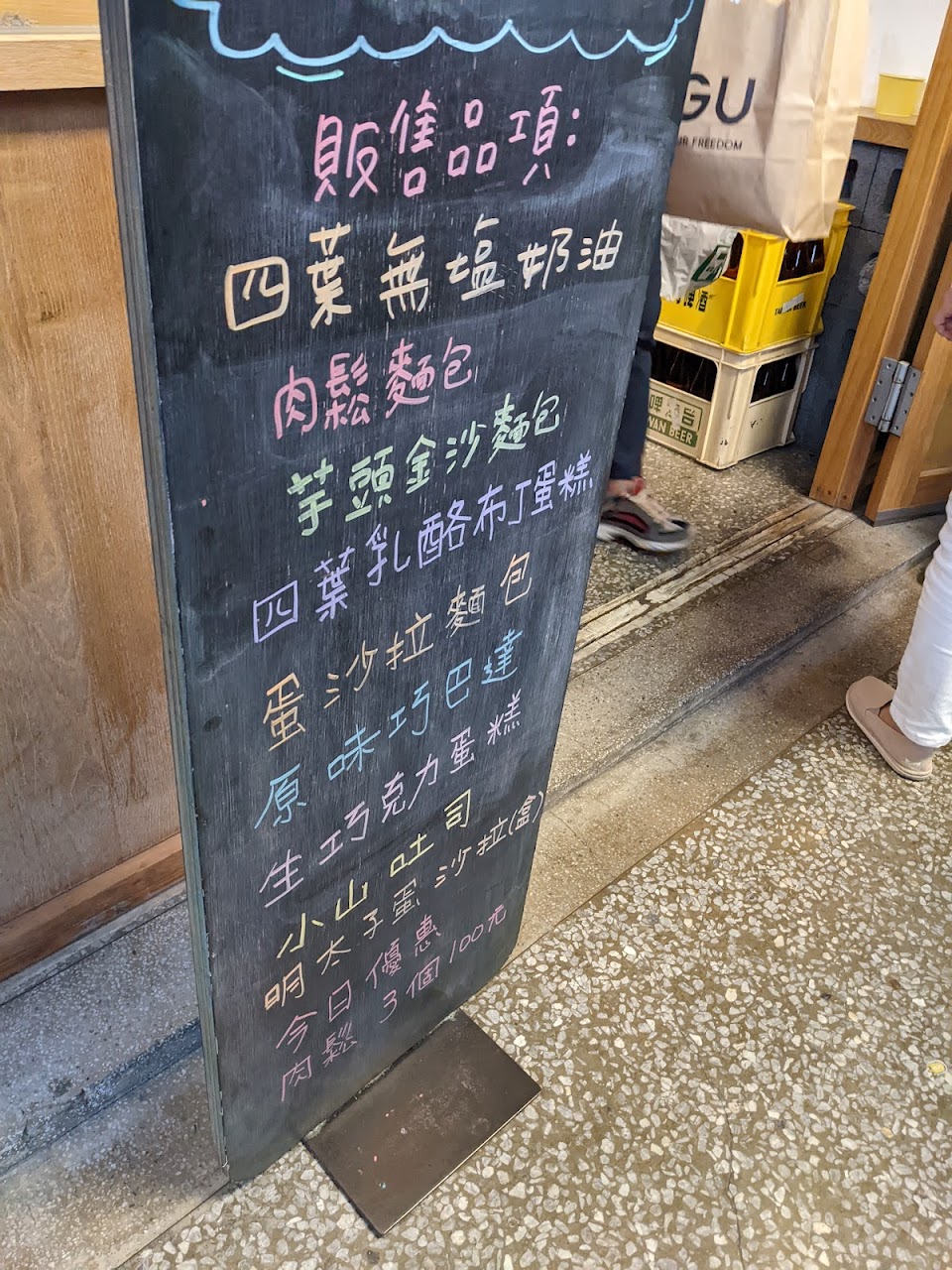 星期日三點五十分到達,店外一堆人完全嚇到的概念,原來剛好碰上發號碼牌的時間,功課沒做足並不知道,幸好來的及,拿到的號碼牌已經是29號。後來才知道原來可以網路預訂。約莫等了半個多小時,總算可以入內選購,現場的麵包總類不多,吐司只有兩種,我們買鮮奶吐司和幾個小麵包。冰箱內的芋泥捲很吸引人,可惜要預購。