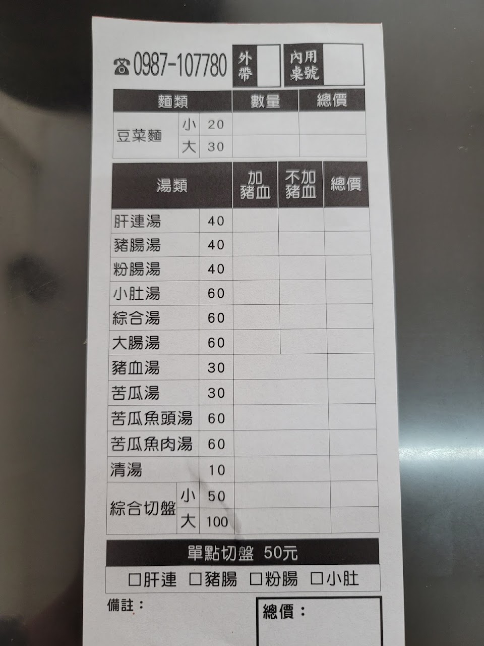 環境非常整潔,容器桌椅乾淨無垢到發亮,這項優點在大馬路旁小吃店裡幾乎找不到。我點了綜合湯,有豬血、內臟,沒有腥臭味、口感軟嫩、湯頭香甜(確實是甜中帶鹹)。