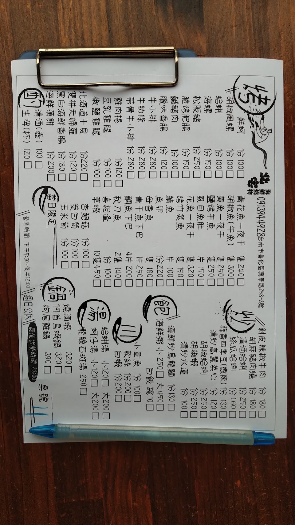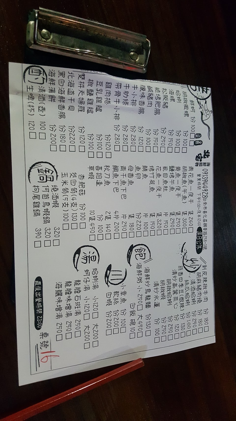 清炒水蓮 一夜干 鹹豬肉 烤蛤蜊 絲瓜蛤蜊 海鮮粥 燙花枝 烤肥腸 烤鮮蚵 胡椒風螺 秋刀魚 烤午魚