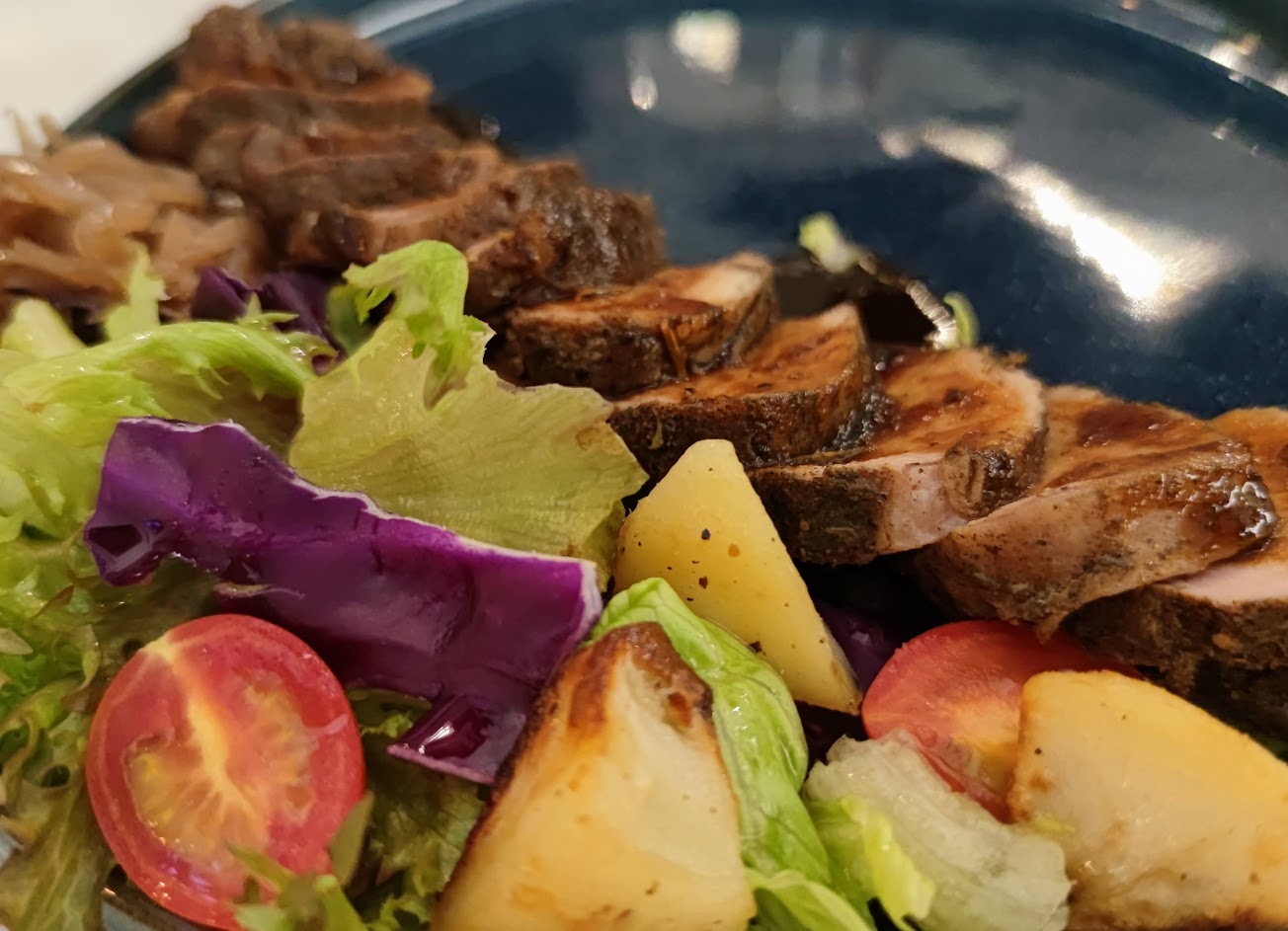 香料烤豬里肌的擺盤非常具特色,完全放在餐盤的半邊,視覺上有些微妙,不過味道還行