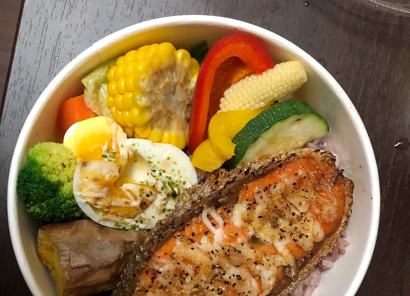 飯盒的蔬菜種類多,飯有摻點鹽巴,吃起來有飯團的感覺